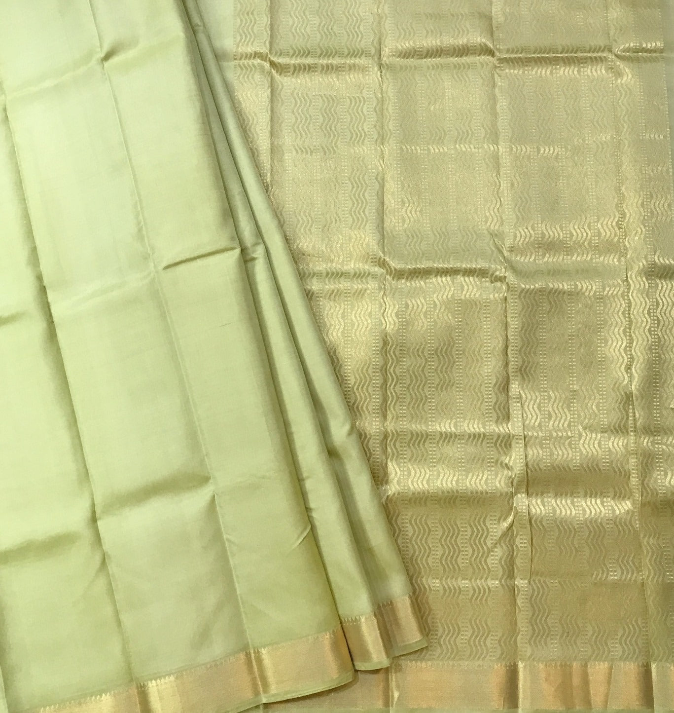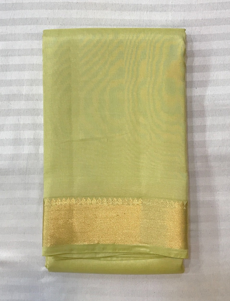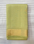 This is an elegant pastel green saree made from a smooth, glossy silk or silk-blend fabric, featuring a subtle golden zari border and delicate woven patterns across the body and pallu, giving the saree a graceful and refined appearance. Its minimal yet luxurious design makes it ideal for festive occasions, traditional ceremonies, and formal gatherings.