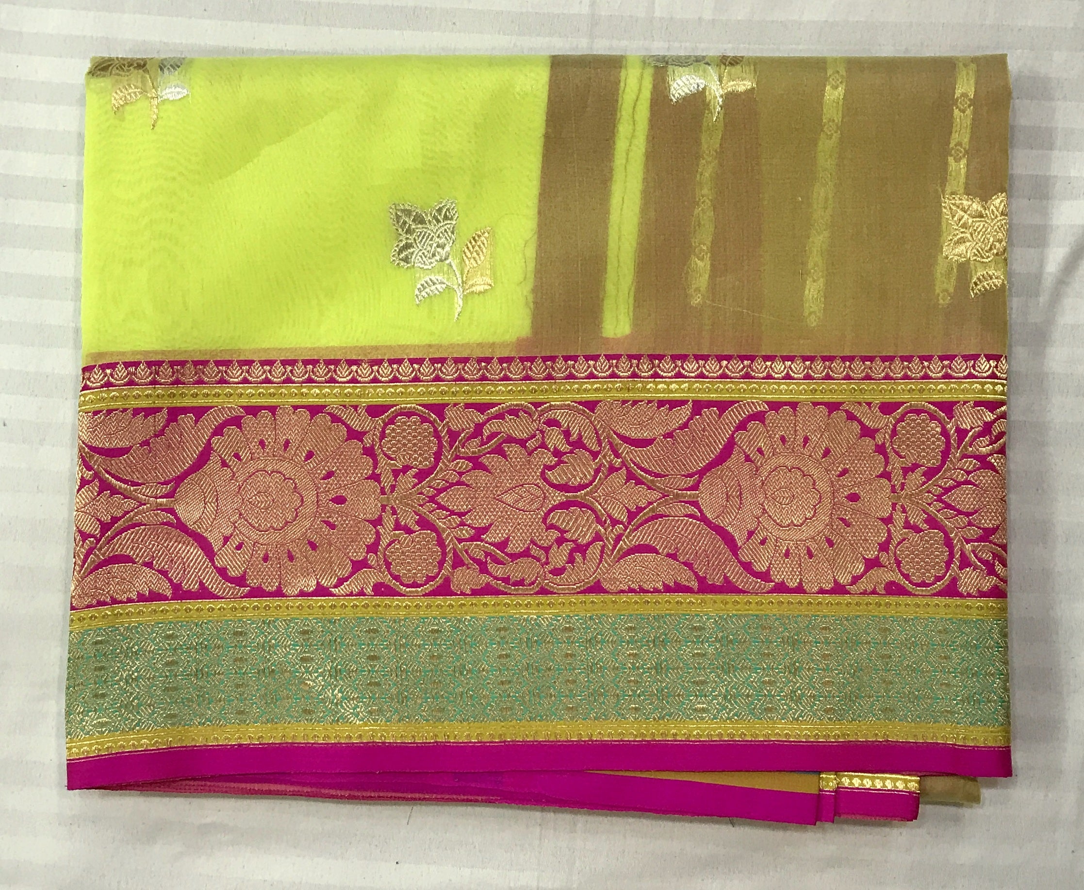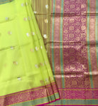 This lemon green Kora Banarasi saree exudes elegance with its exquisite  golden zari work. The luxurious fabric, akin to organza silk. Adding to its charm, the saree is adorned with grand golden-silver zari buttis, creating a regal appeal. The highlight of this masterpiece is its breathtaking pallu, embellished with an intricate design that enhances its timeless beauty. A richly woven floral zari border lends the saree a splendid wedding and festive allure, while the classic Banarasi golden hue on the border adds an element of sophistication.