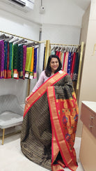 A timeless black Paithani saree adorned with delicate gold zari stripes and a rich red pallu featuring traditional peacock and floral motifs. The intricate zari work adds a regal charm, while the vibrant colors of the pallu beautifully contrast the classic black body. Perfect for festive celebrations, weddings, and special occasions, this saree blends heritage craftsmanship with graceful elegance.