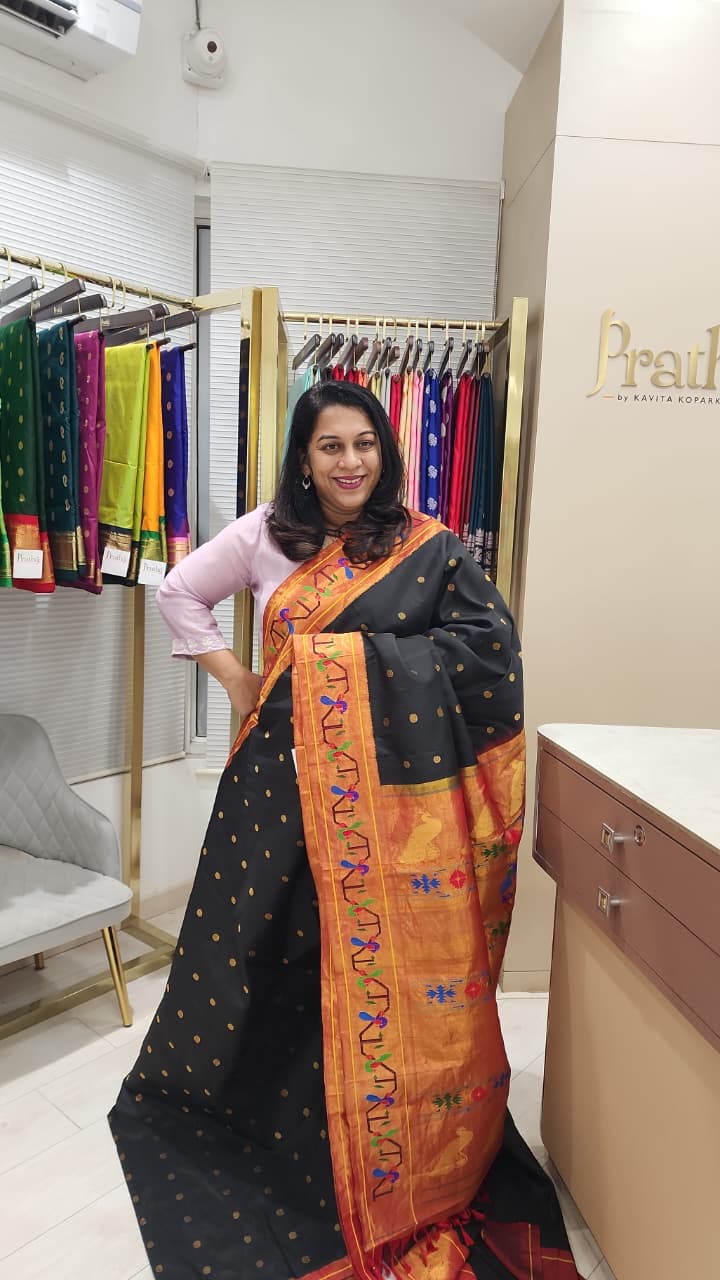 This Royal Paithani is the epitome of elegance, weaved with care and love for special days. The intricate weaving, the delicate motifs and the clean workmanship brings magic and soul to this black Paithani. The designer zari border with beautiful floral design running through it, makes this Signature Paithani a unique weave.