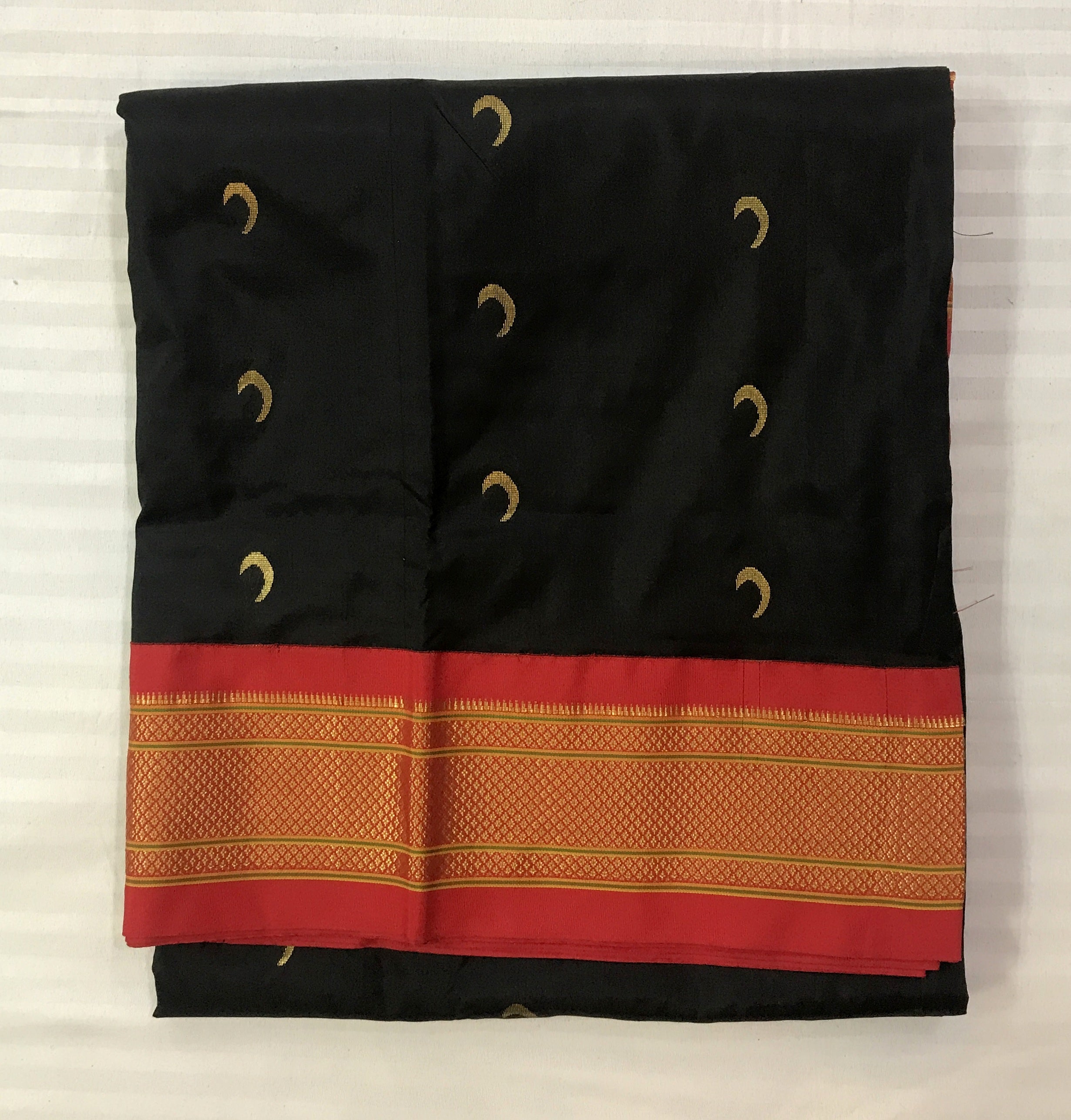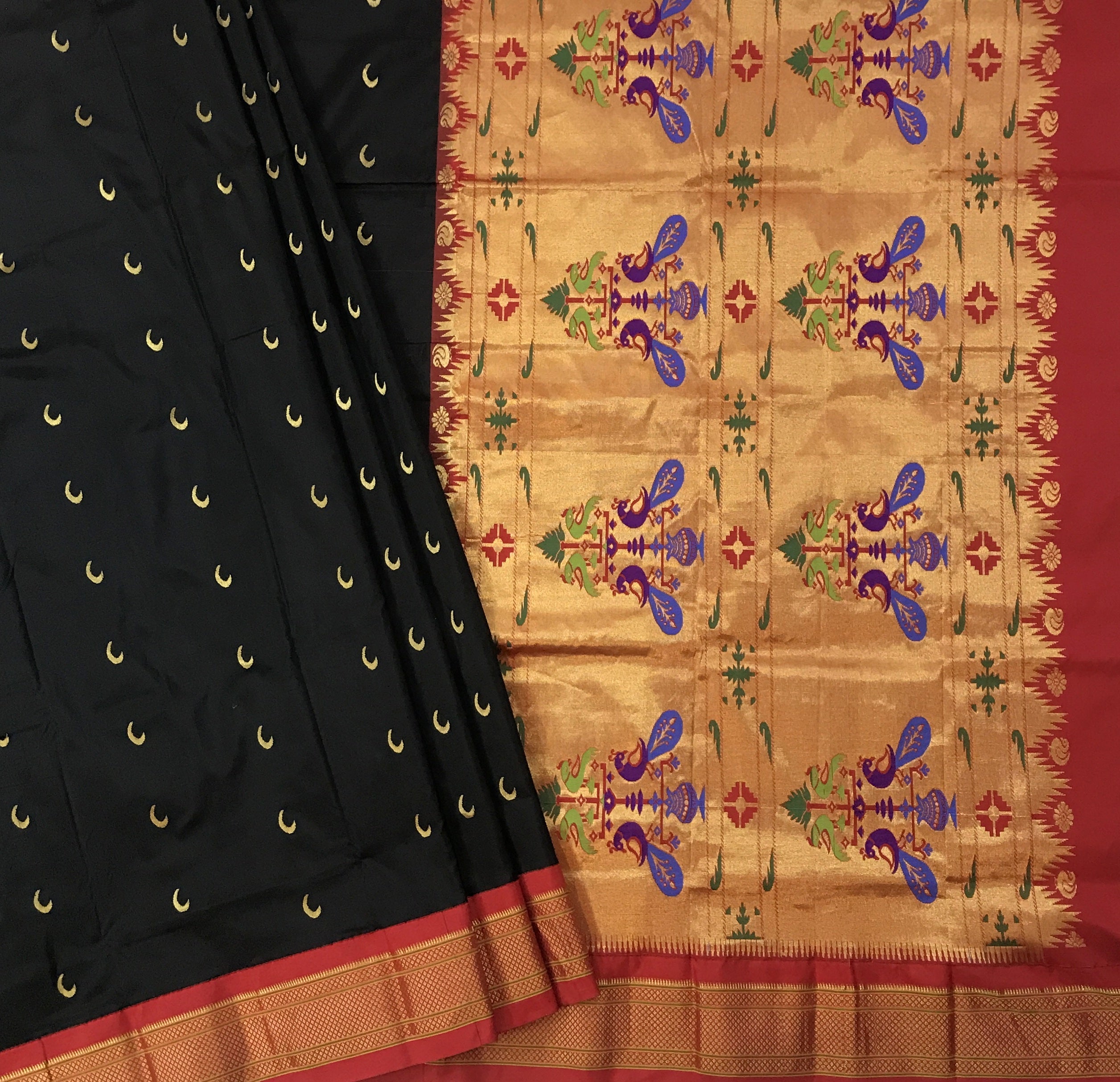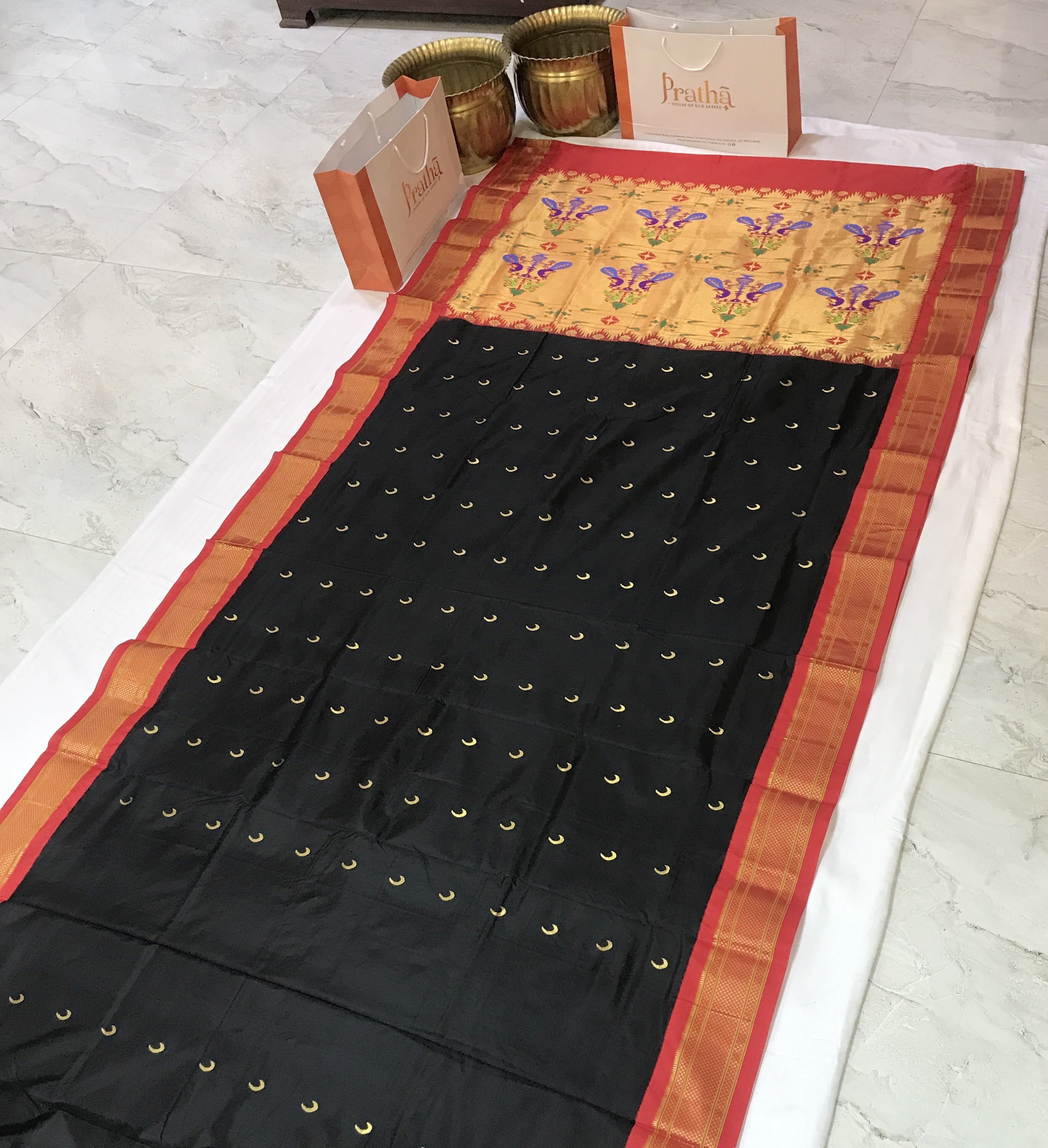 A stunning and timeless Black Paithani that exudes grace and elegance! The rich black body adorned with golden zari crescent buttis gives this saree a royal charm. The exquisite red golden zari border elevates the look, while the grand and intricately woven golden Paithani pallu stands as the highlight of this masterpiece. This beautiful combination of black and gold makes it perfect for weddings, festivals, and special celebrations. A true collector’s piece that showcases the beauty of traditional weaving!