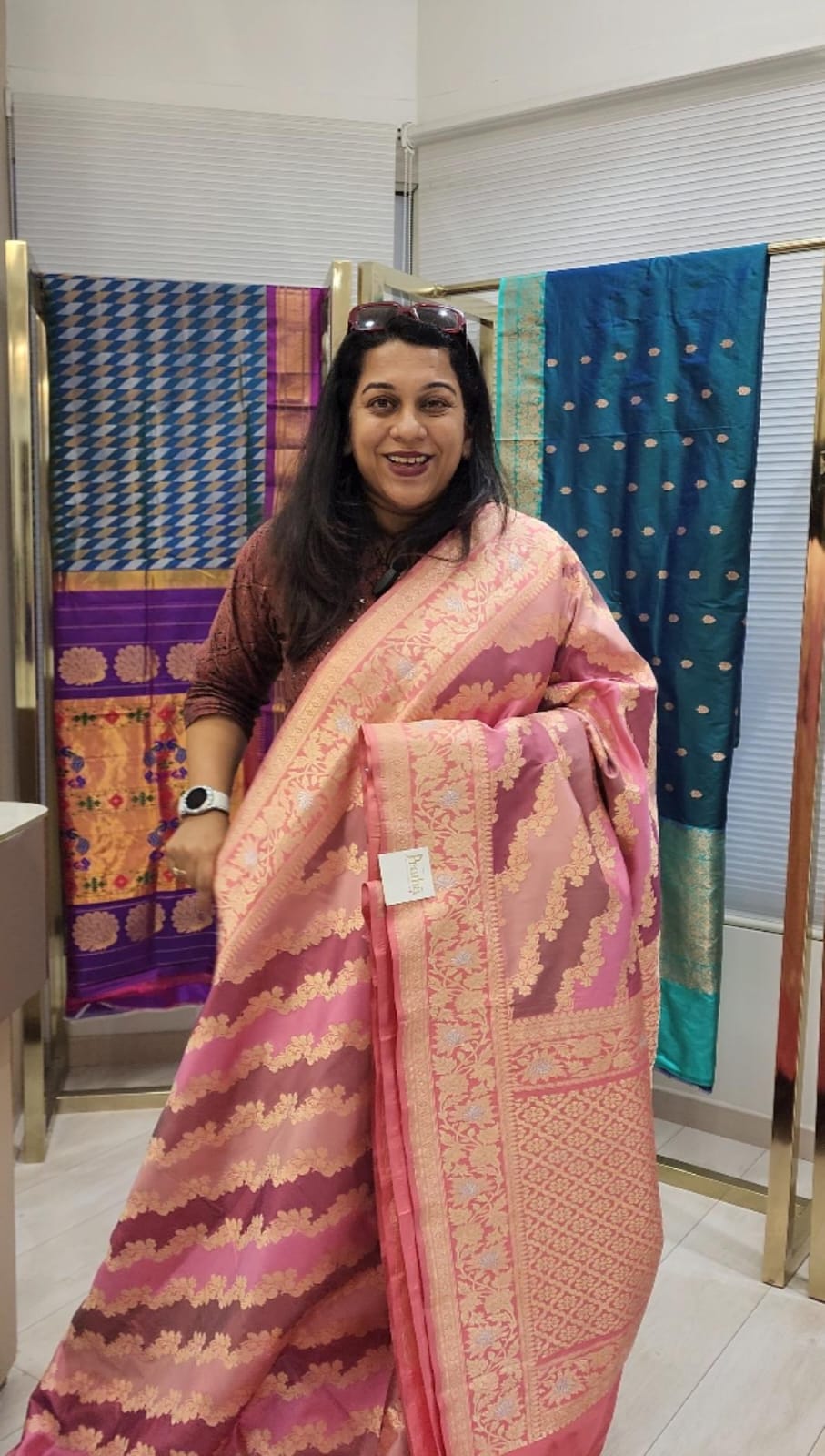 A handwoven Banarasi saree in a striking multi colour hue, enriched with intricate gold zari work across its warp and weft, this saree is a true statement of timeless elegance. The beautifully crafted handwoven border and richly detailed pallu lend a regal charm, while the delicate zari motifs running through the body add a soft, graceful touch. The lustrous zari detailing, magnificent border design, and vibrant yet warm colour palette come together to make this saree a classic signature piece—perfect for weddings, festive celebrations, and special occasions.