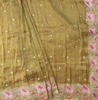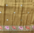 A stunning olive-golden brown tissue Banarasi saree featuring delicate gold zari buttas and an elegant woven border with lotus motifs. Its sheer, lightweight texture paired with rich Banarasi detailing creates the perfect blend of subtle shine and timeless grace.