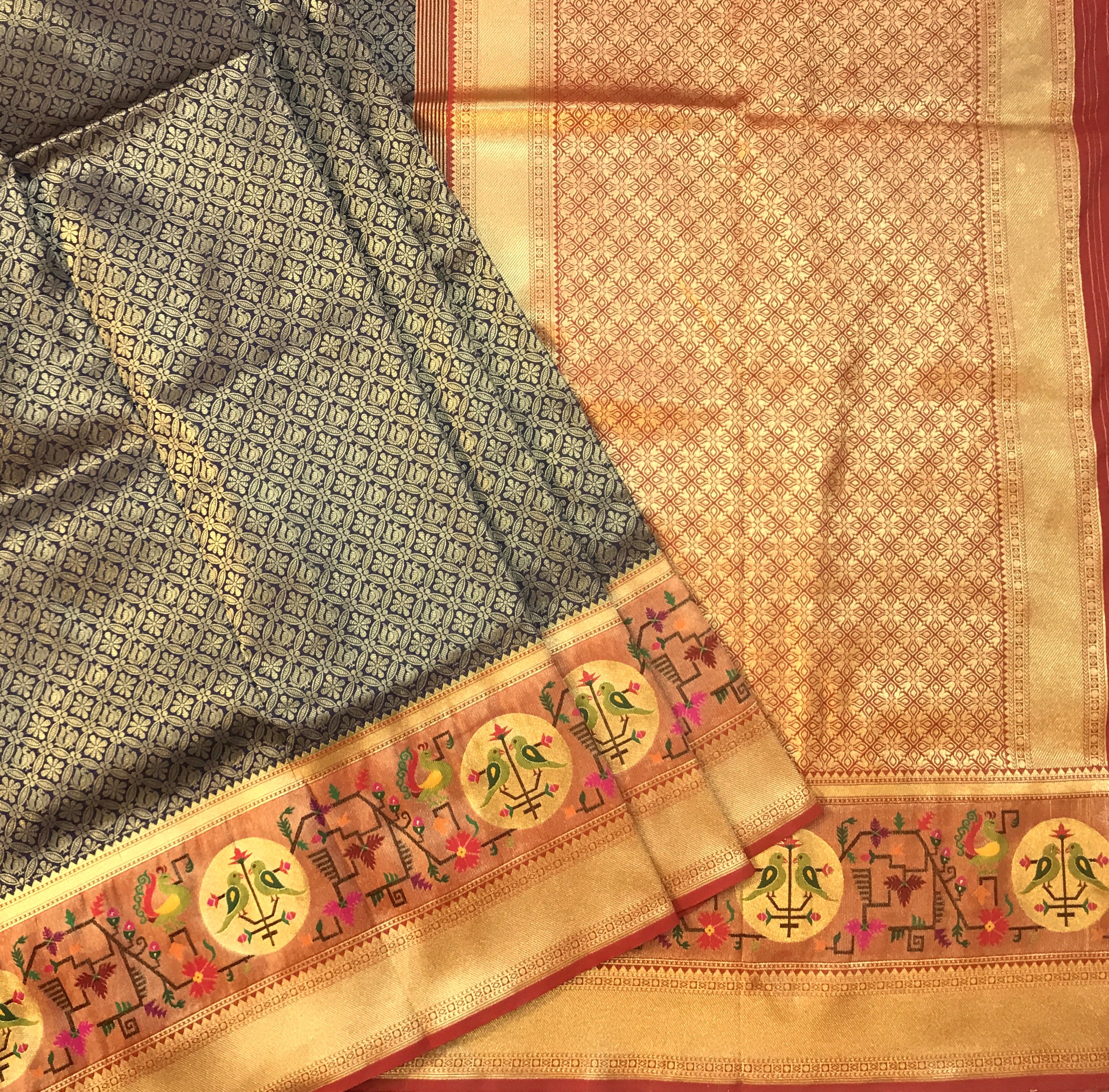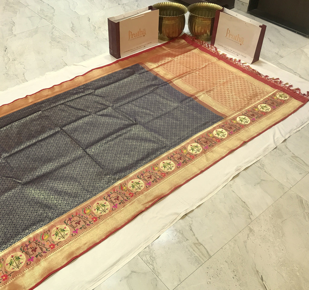 It's a fusion of Banarasi and Paithani saree. A very pretty shade of purple-blue power loom Banarasi saree with golden zari brocade design all over the weave, this saree is a stunner! The unique colour makes you stand out! It has a different shaped floral-peacock butti design all over the saree. Do not miss that, this Banarasi saree with specially inspired paithani border and zari pallu looks different and attractive.