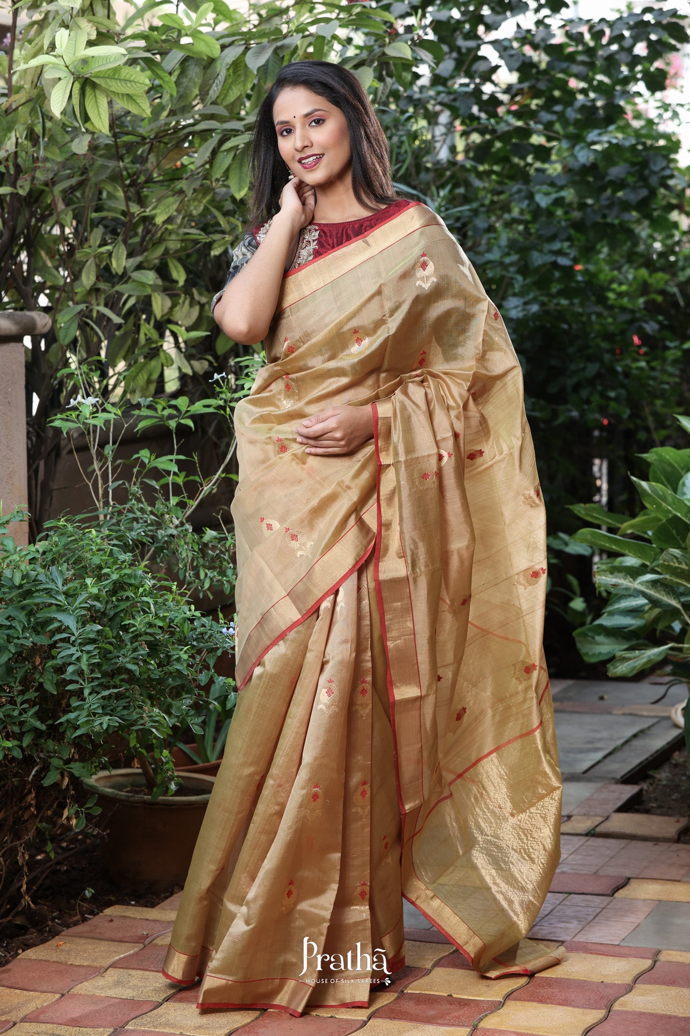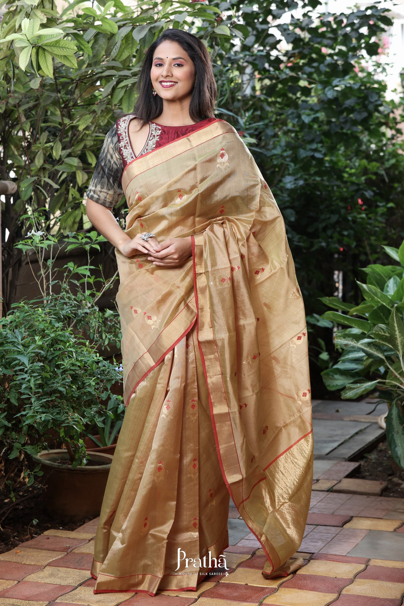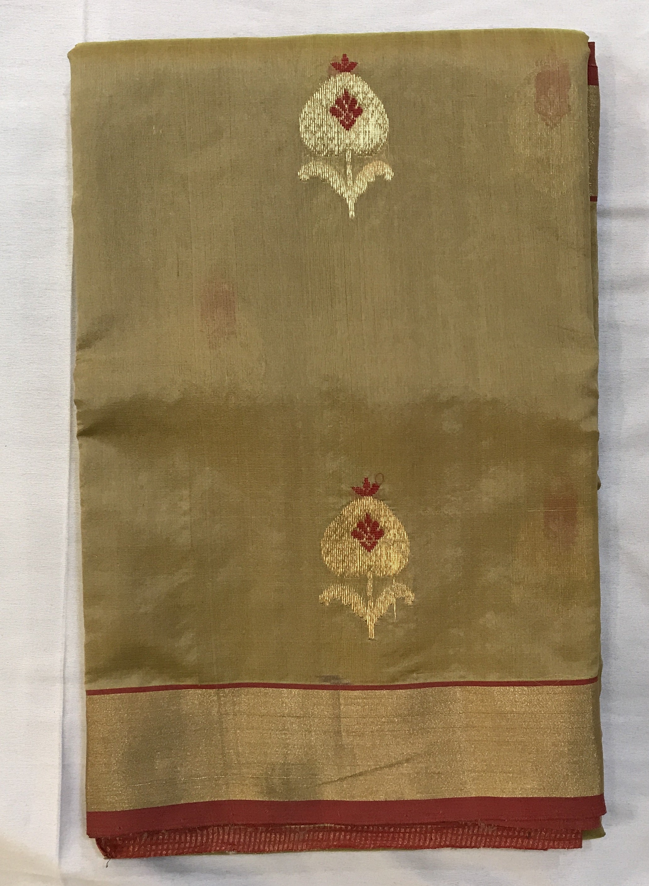 Chanderi is a handloom material which is close to kora silk or organza, which is slightly stiffer type of silk. Chanderi sarees is will bloom a bit but that is the beauty of these saree. A very different type and beautiful rotating shade of golden - brown- green coloured Chanderi Silk saree with golden zari border and pallu looks great! Chanderi fabric is produced by weaving in silk and golden zari in the traditional cotton yarn that results in the creation of the shimmering texture, transparency and great work in art and design. It is also available in different colors and has slight sheen to it which makes it wearable for party's as well.