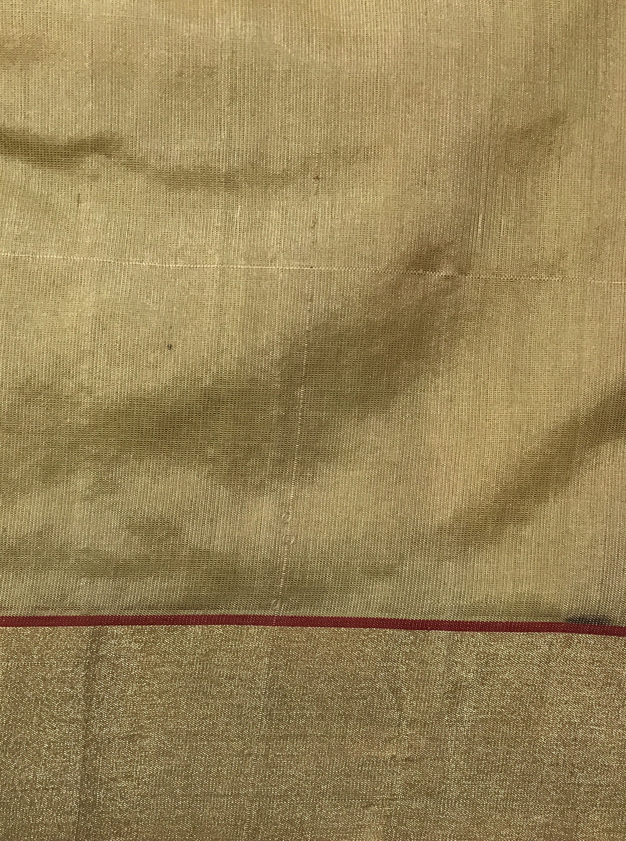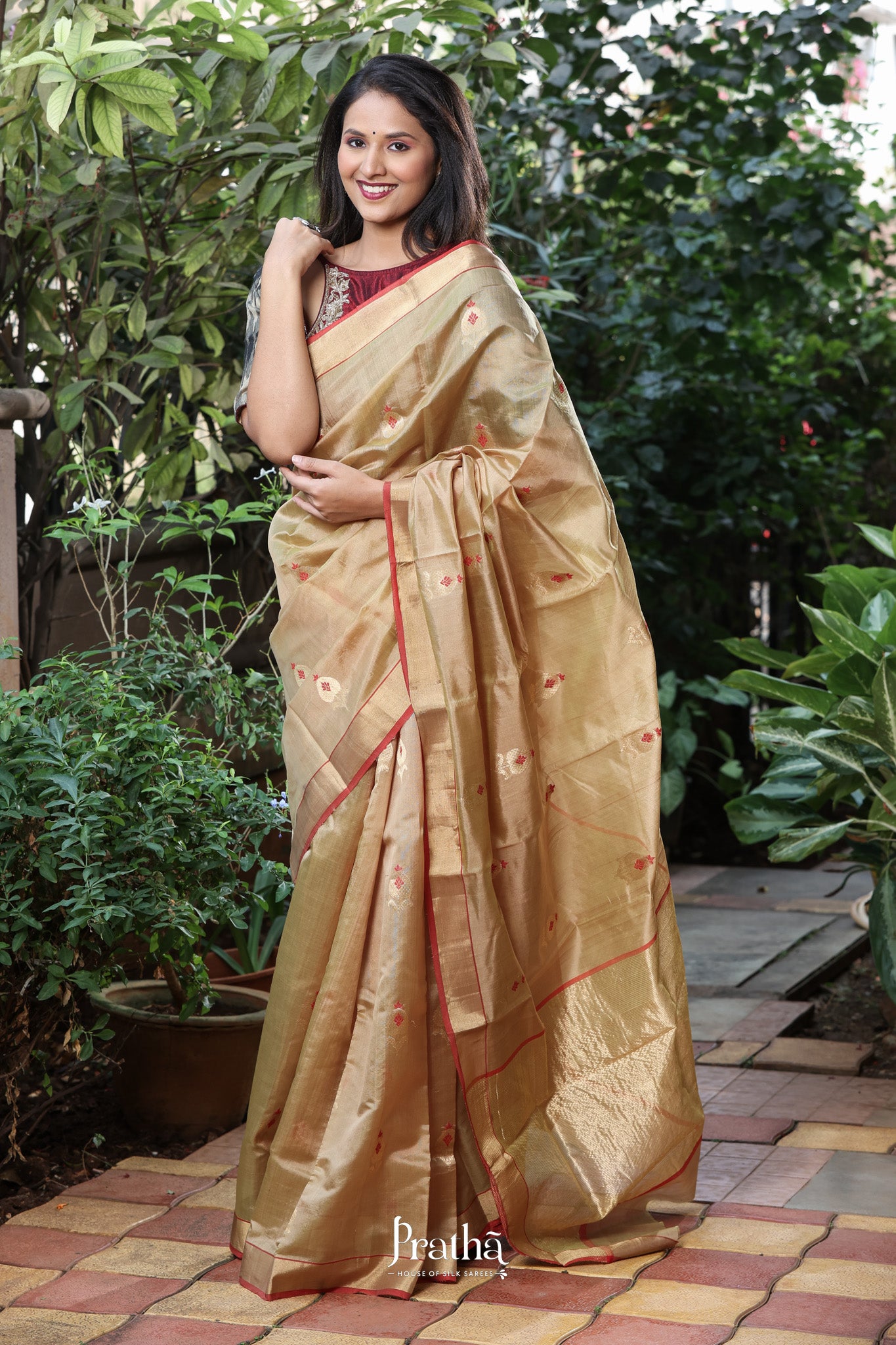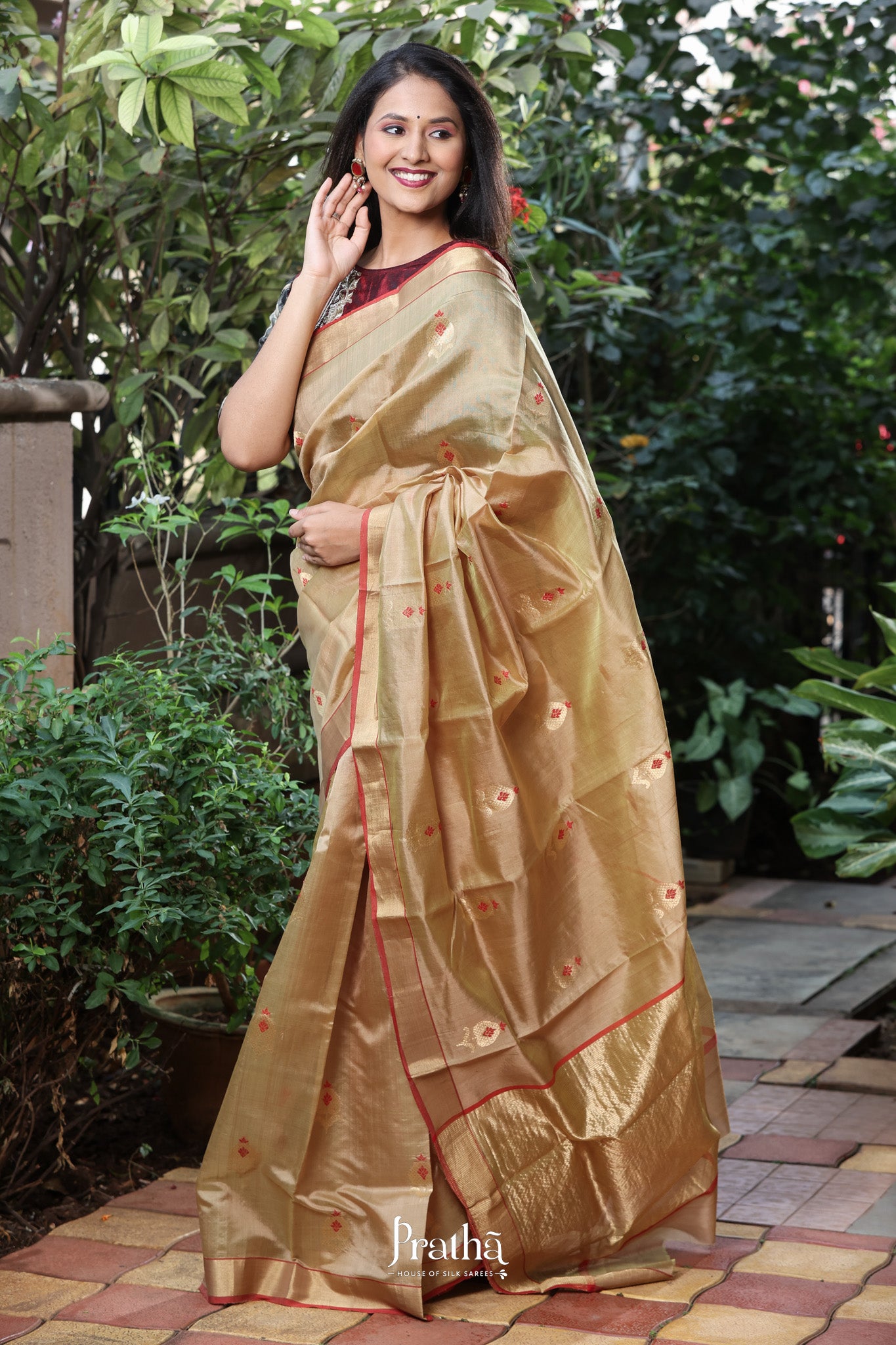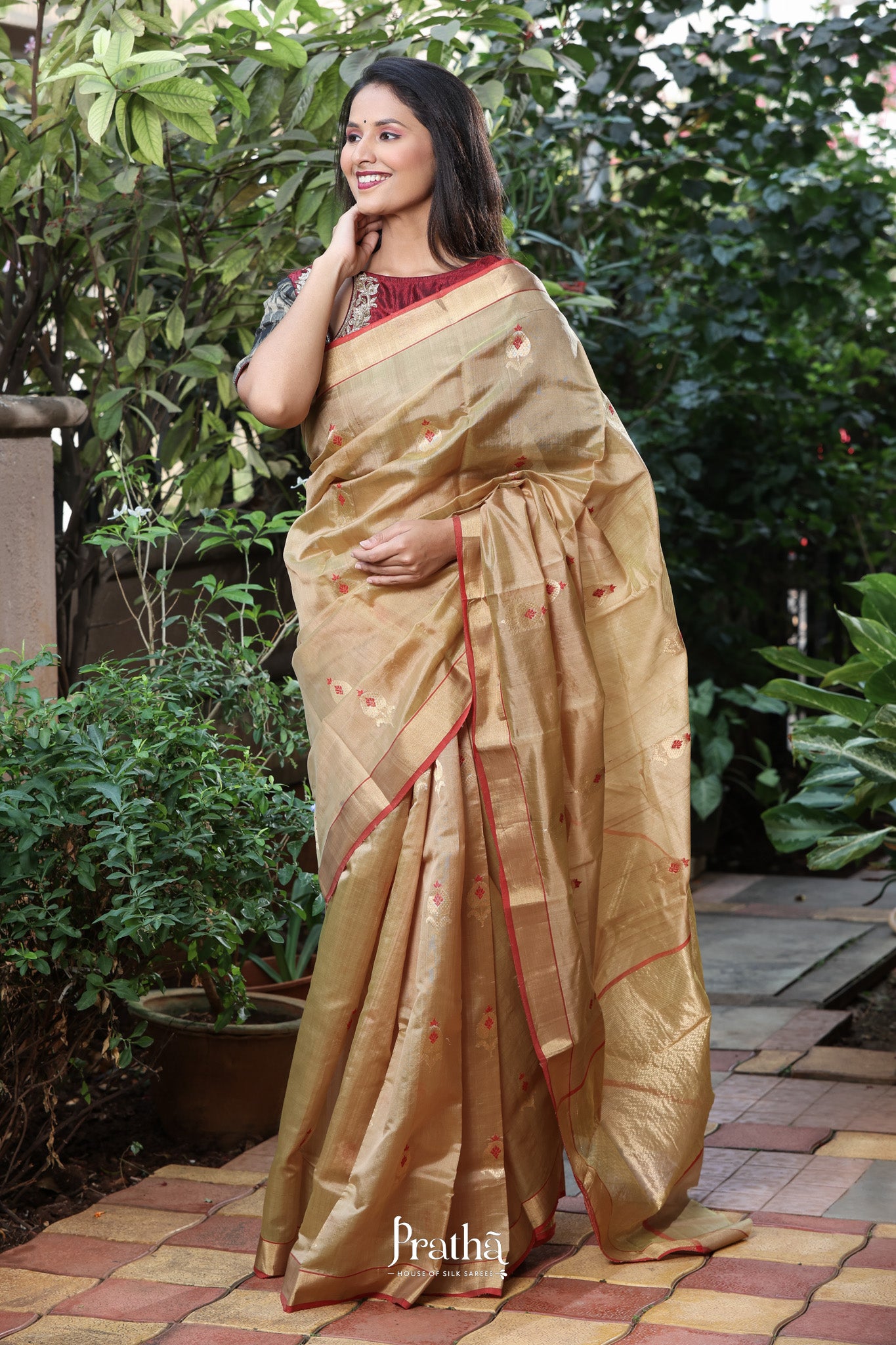 Chanderi is a handloom material which is close to kora silk or organza, which is slightly stiffer type of silk. Chanderi sarees is will bloom a bit but that is the beauty of these saree. A very different type and beautiful rotating shade of golden - brown- green coloured Chanderi Silk saree with golden zari border and pallu looks great! Chanderi fabric is produced by weaving in silk and golden zari in the traditional cotton yarn that results in the creation of the shimmering texture, transparency and great work in art and design. It is also available in different colors and has slight sheen to it which makes it wearable for party's as well.