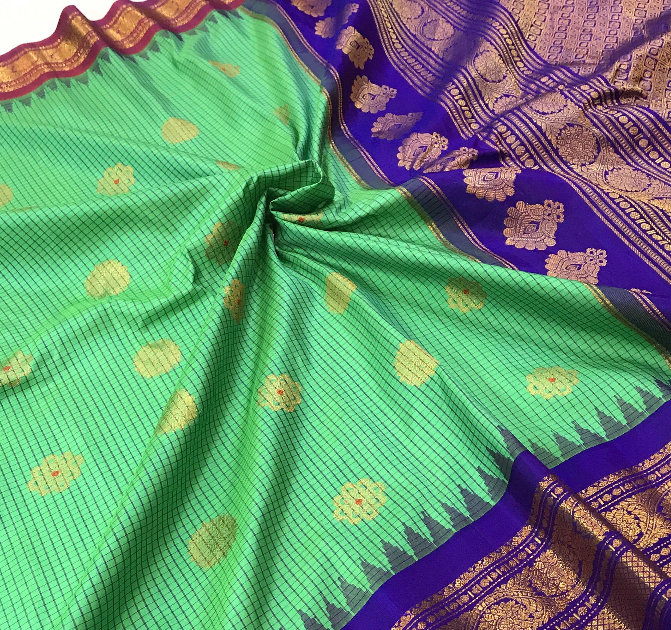 The classic combination of green and blue pure silk Gadhwal looks fabulous with its checks pattern woven in red silk thread as well as the big circle shaped butti woven in golden-silver zari. This pattern of checks is particularly special for its 'small checks' design. Do not miss that, this saree has 'Ganga-Jamuna ' border ( on top pink coloured and on bottom blue coloured), add beauty to this soothing weave!
