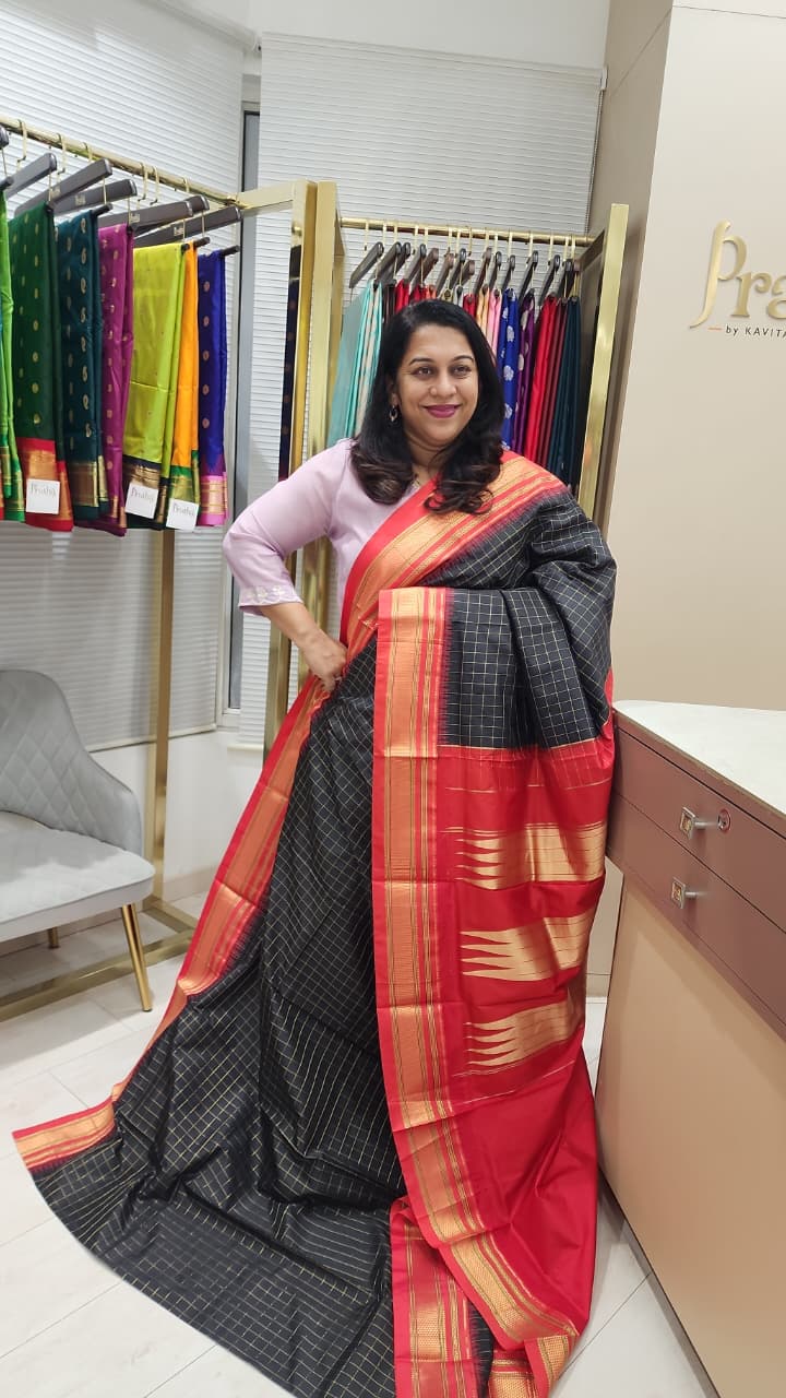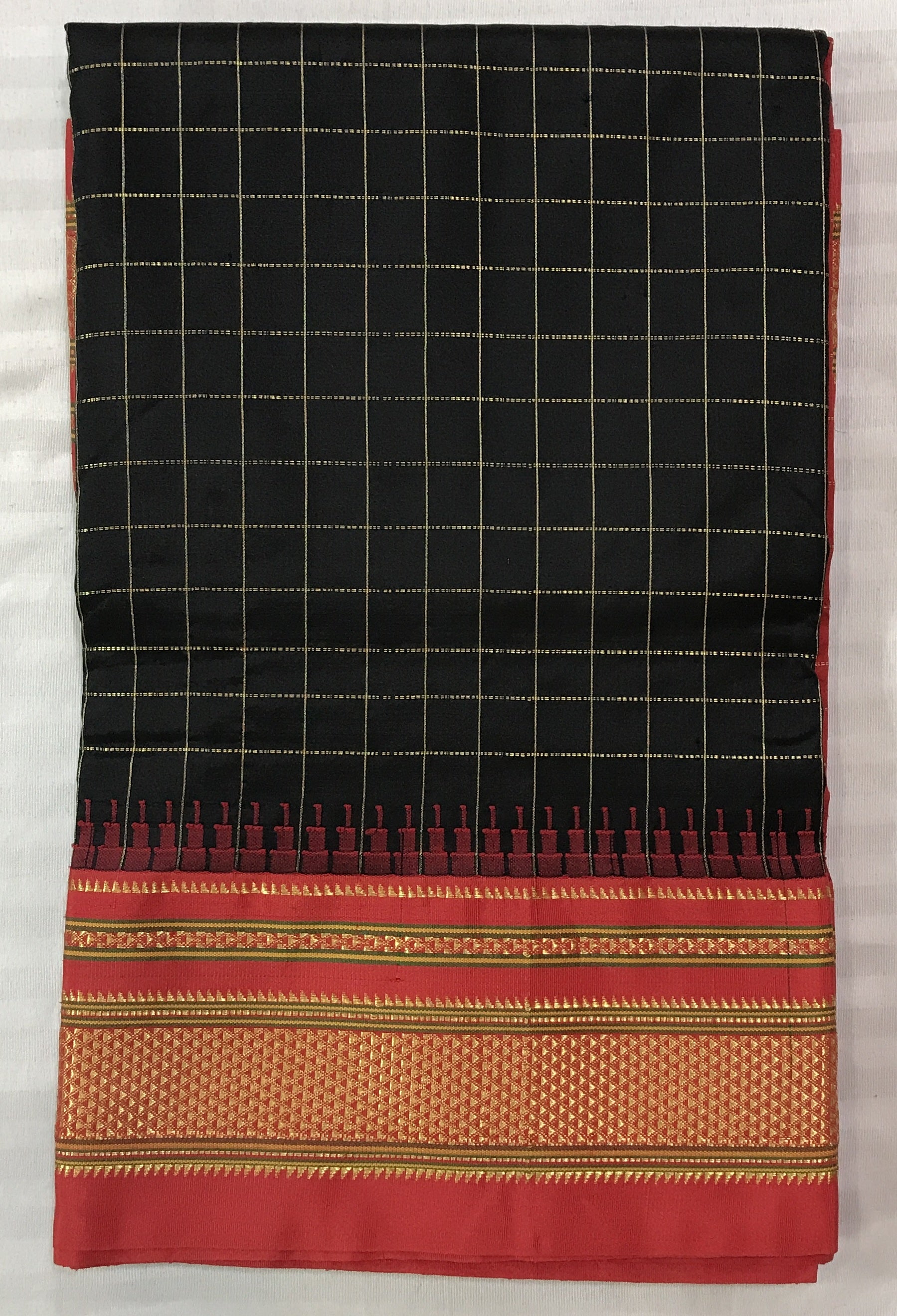 A lovely 'black' colour checks design power loom Irkal teamed up with the red temple design border and golden zari pallu looks elegant. The simplicity of the pallu adds to the elegance of this saree. The zari checks and the traditional design with temple border give a festive touch to this weave.