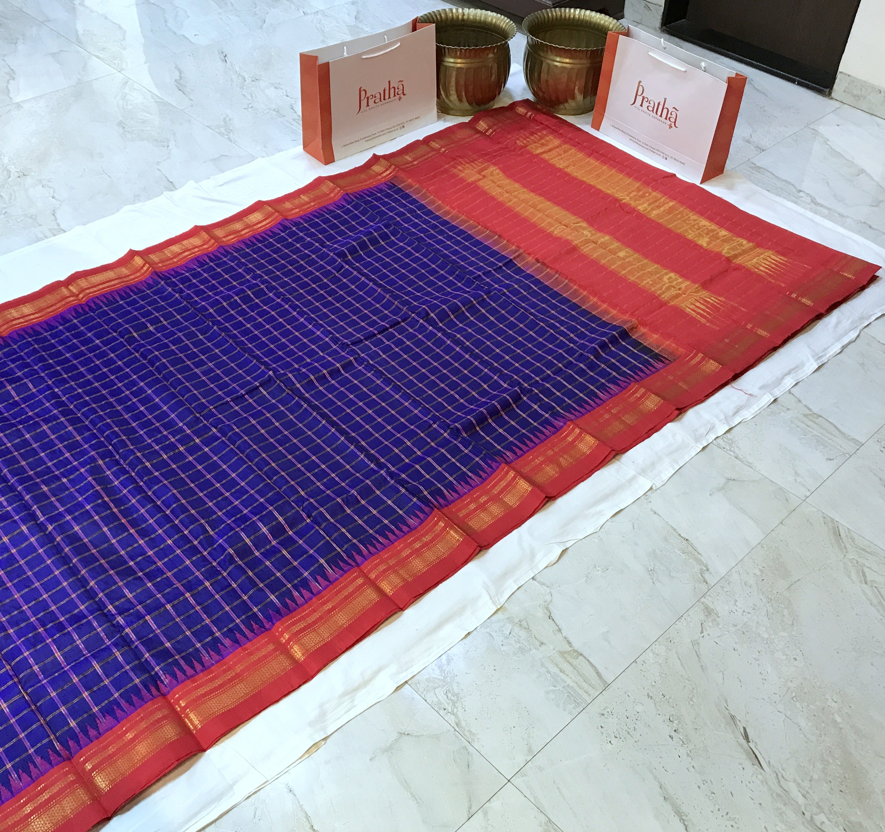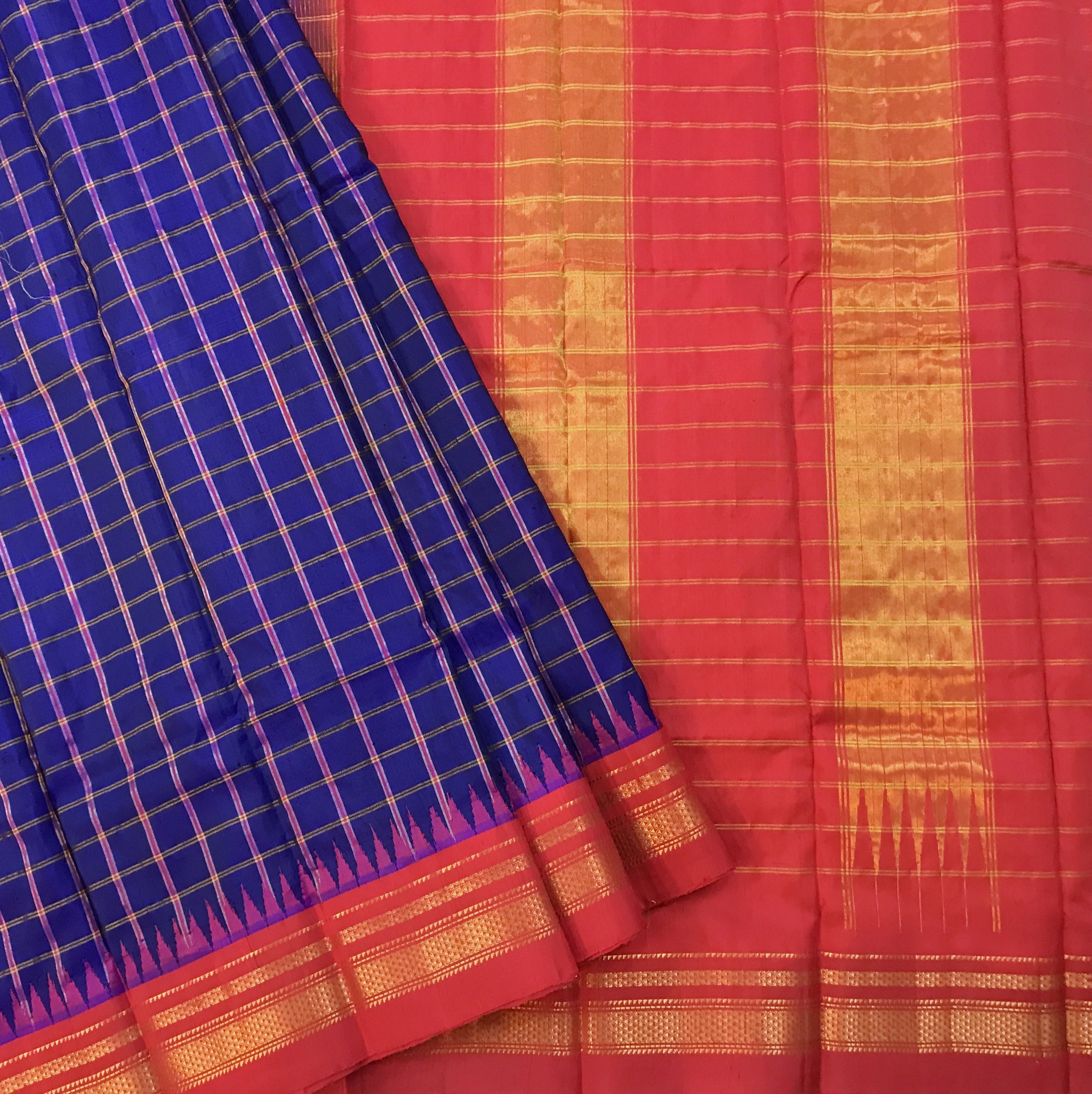 This is very pretty combination of blue and fresh red looks magnificent especially with the zari checks woven throughout this pure silk handwoven Irkal .This classic weave looks stunning when draped. The zari checks and the traditional design with temple border give a festive touch to this weave.