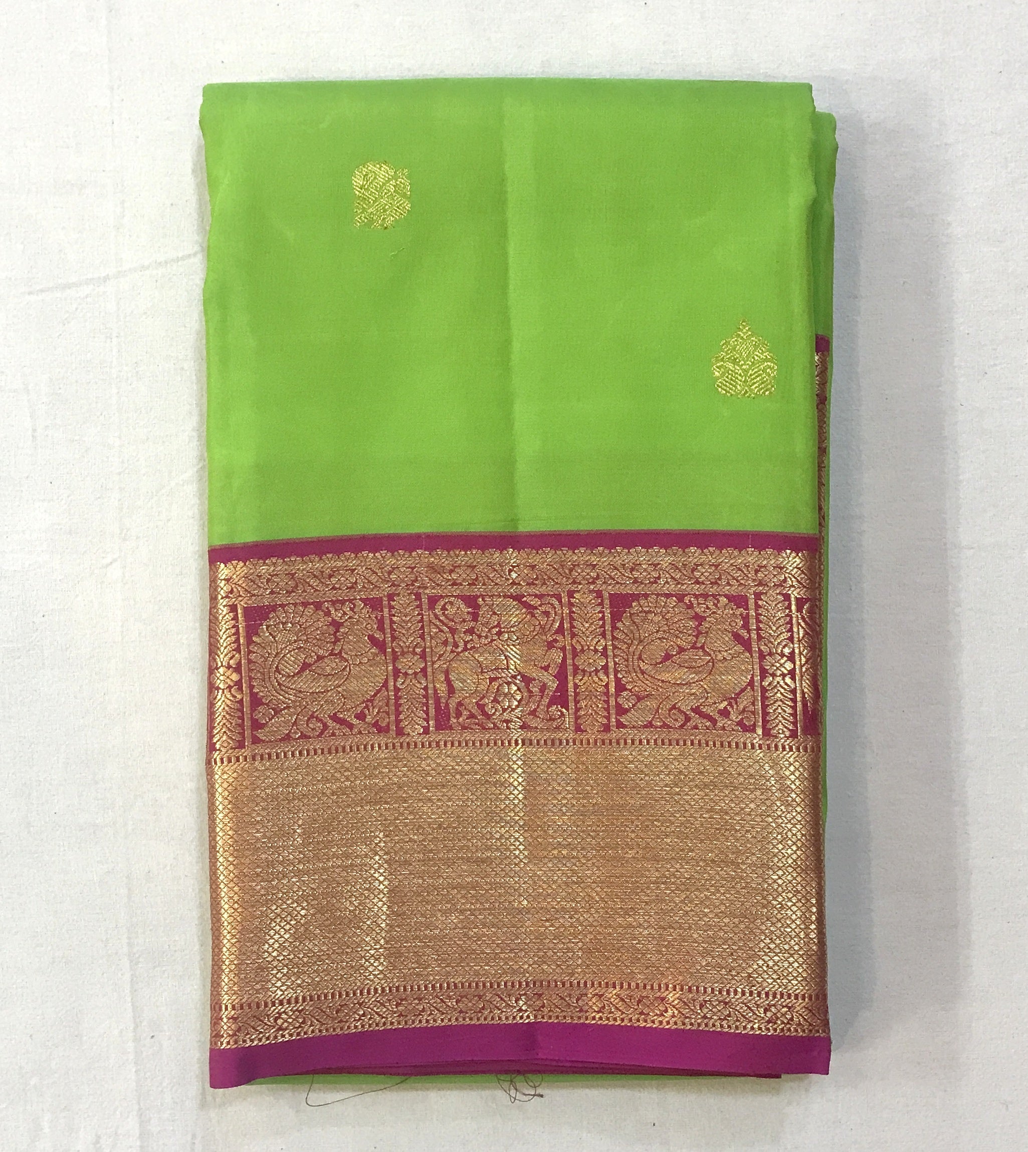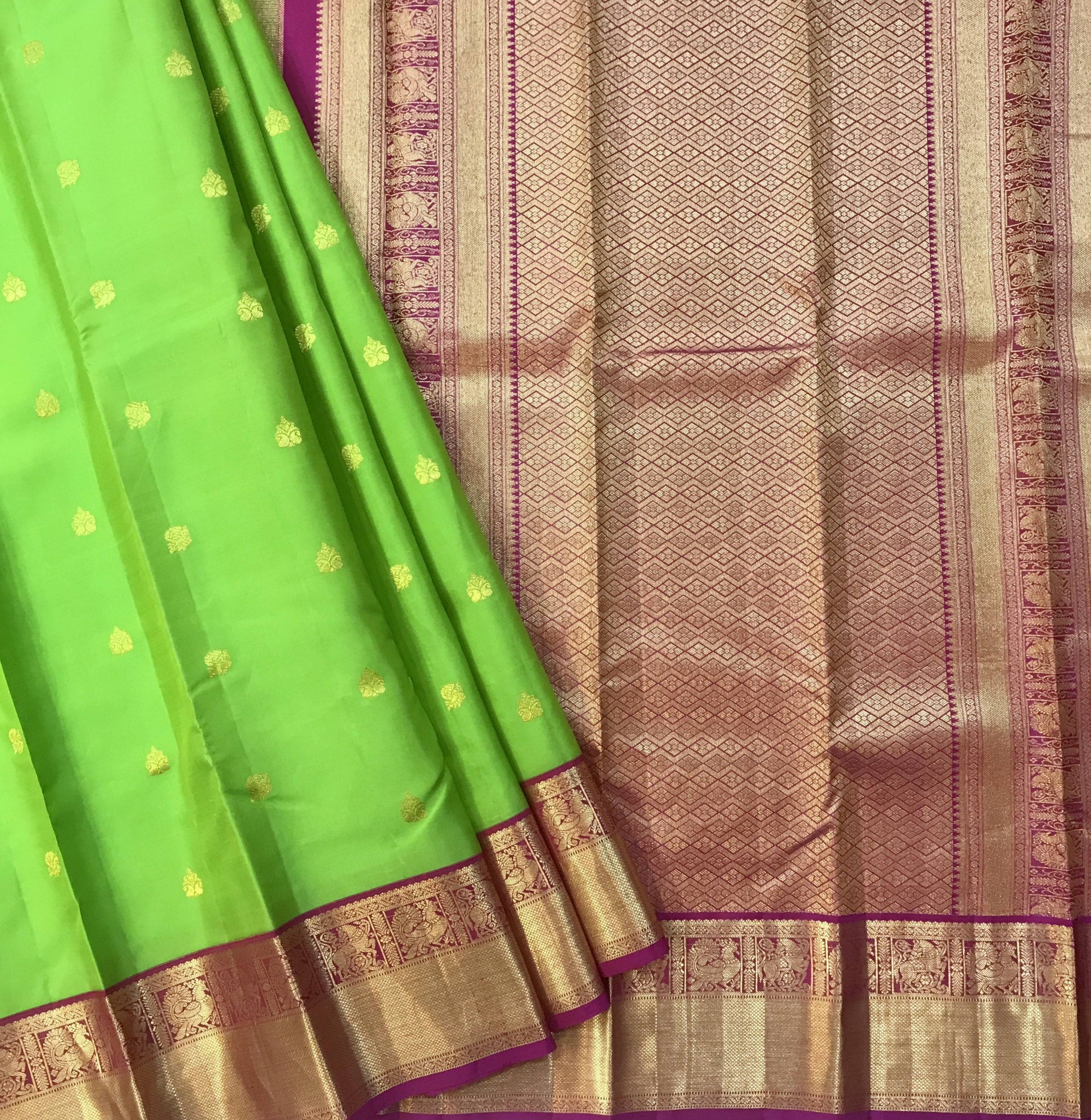 A pure parrot green colour saree with a golden zari border looks incredible! This pure silk Kanjeevaram is a unique one. Apart from its combination of colours, the golden zari border with peacock (motifs) design border and the different big shaped floral butti are also beautiful as compared to the traditional Kanjeevaram designs . Do not miss the butti highlighted with golden zari thread! This is simply beautiful.