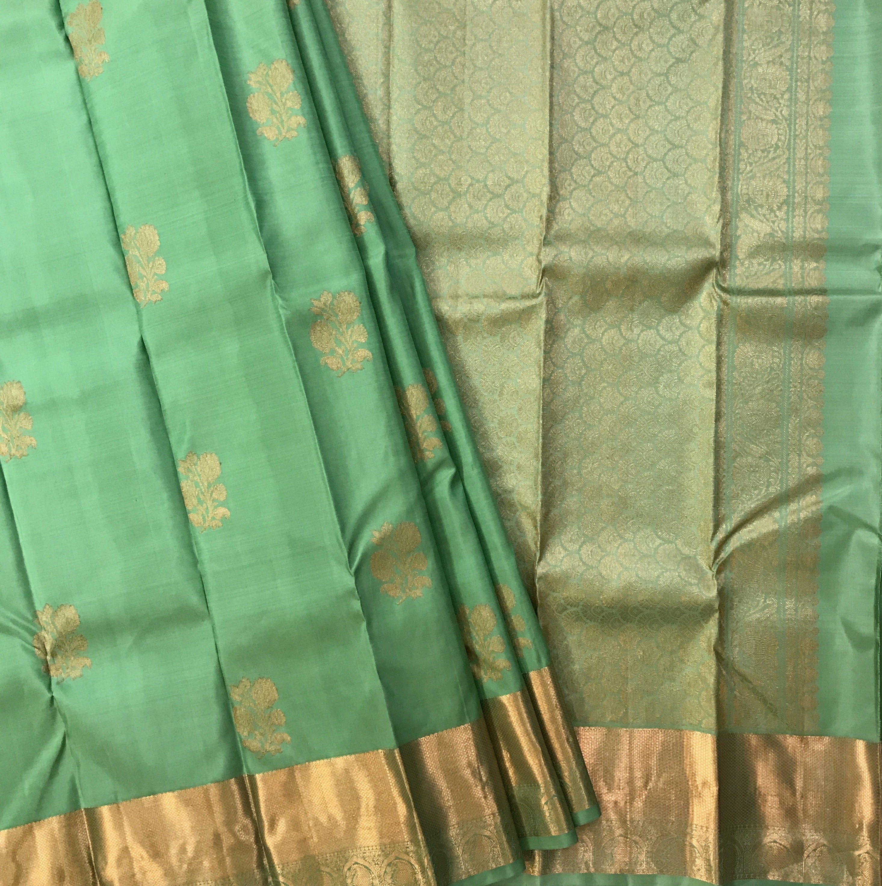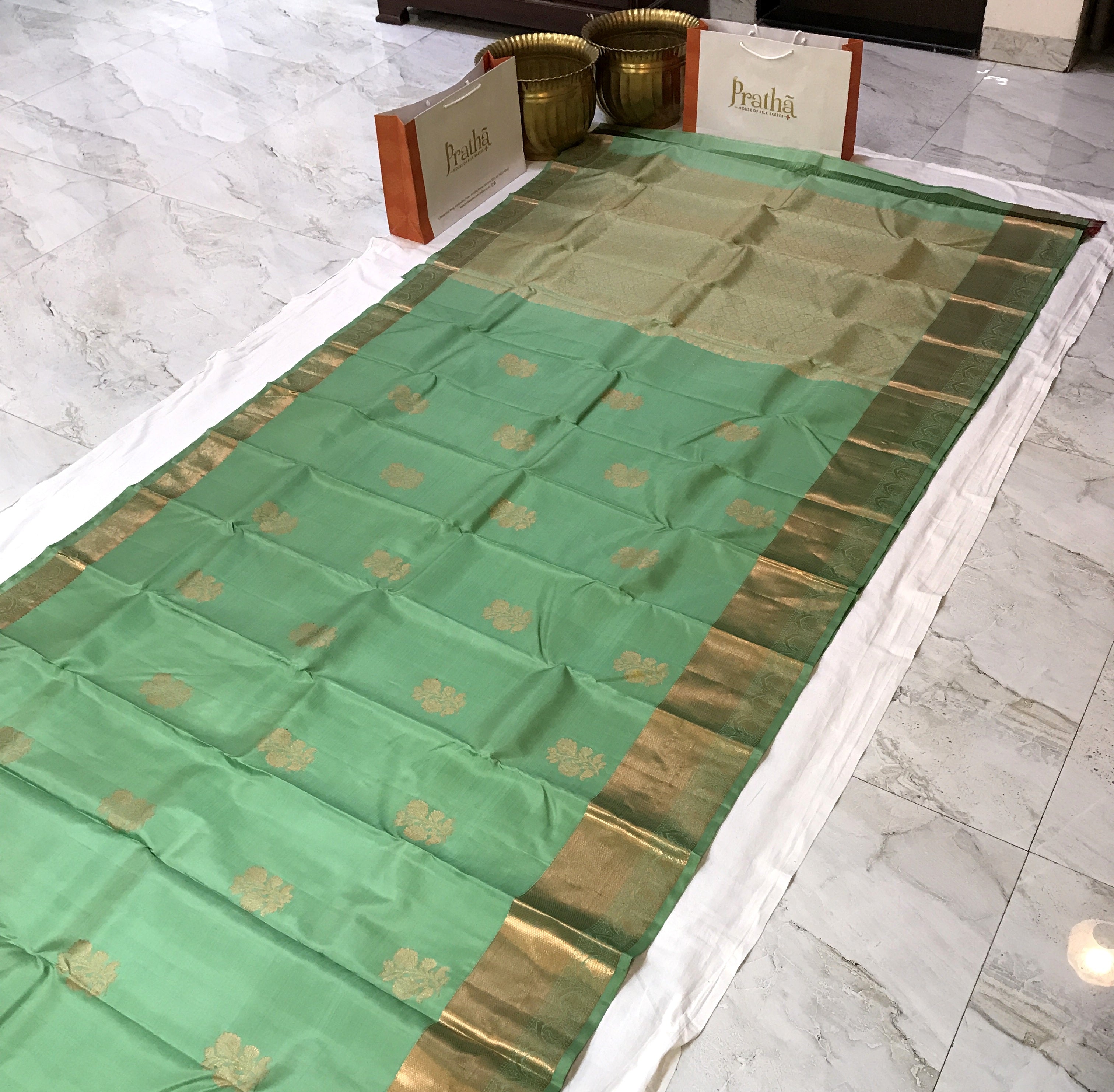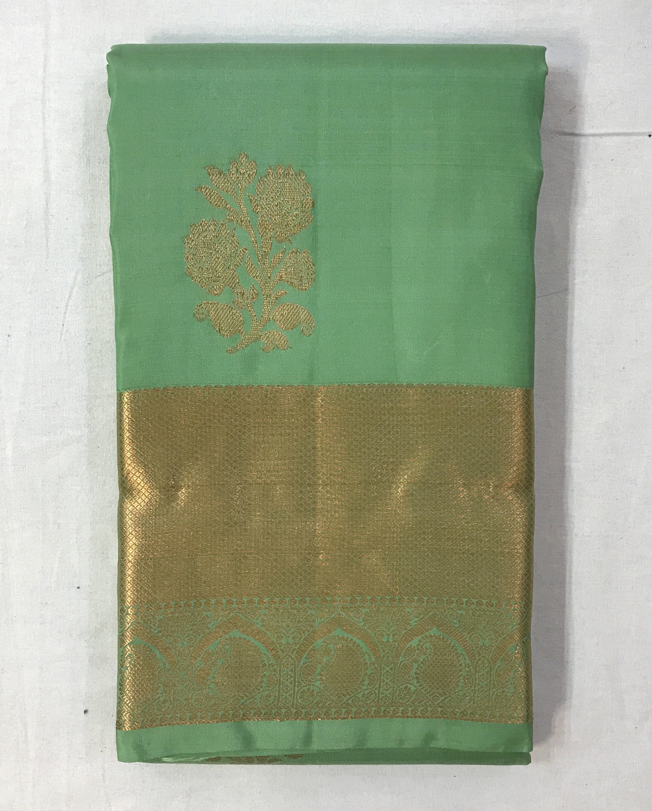 This traditional Kanjeevaram is endorses vibrancy through its bright parrot green colour! This perfect pista green and golden , with the sheen of pure silk looks festive and classy. With the golden zari as its border and zari pallu, there is a balance of colour in this Pratha Kanjeevaram. The intricate florak shaped butti and the equally intricate golden zari design on the border and pallu makes this saree an attractive one! The floral motifs running through the border add to the grandeur of this saree!