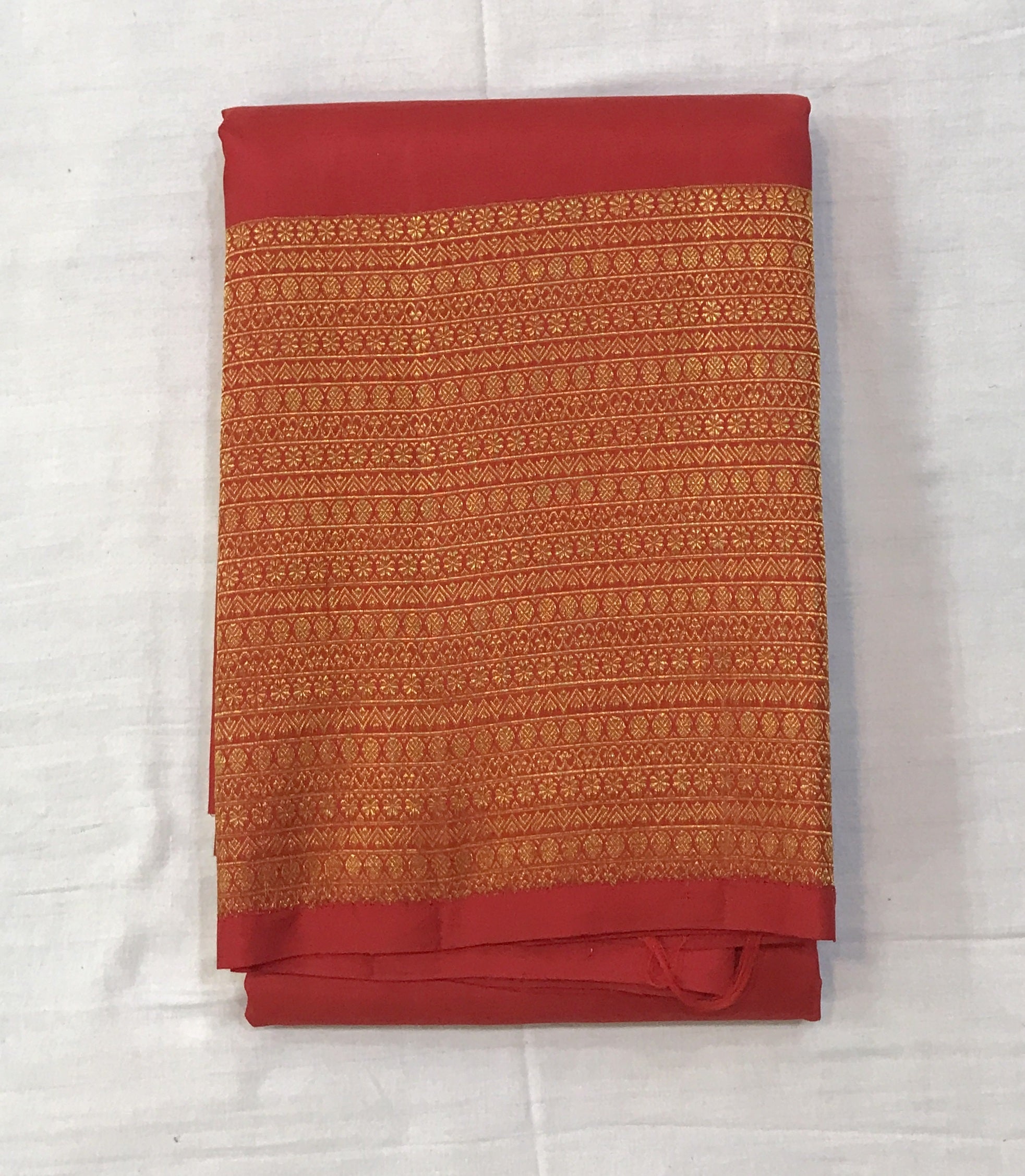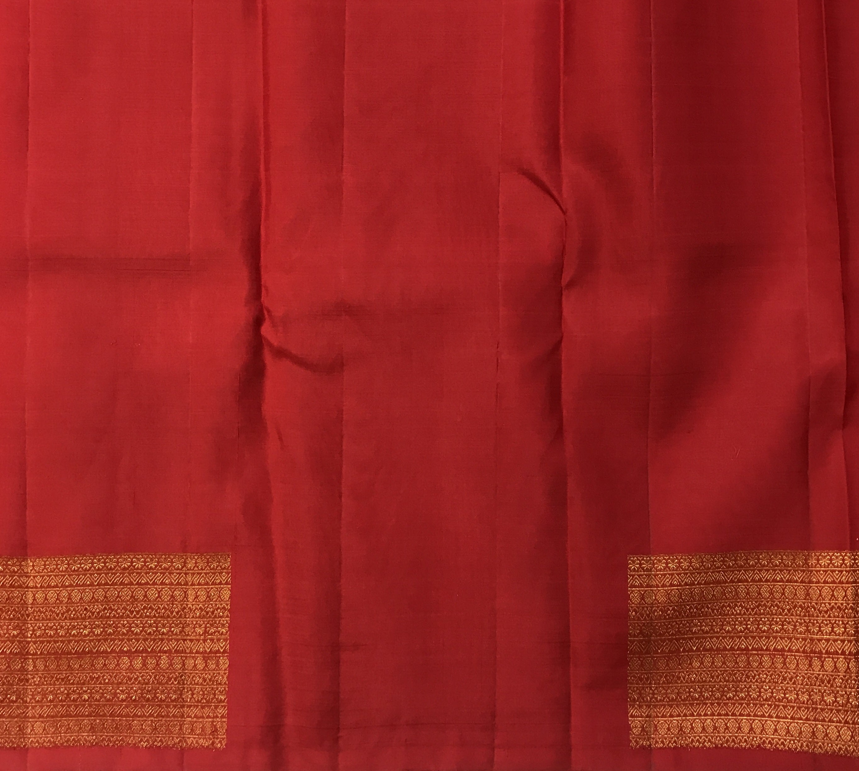 The classic shade of red with a golden zari border Kanjeevaram looks fabulous with its small butti woven in golden zari thread. The elegant self coloured broad border richly enhances the overall drape, while the golden zari golden pallu complements the body beautifully, completing the regal look.