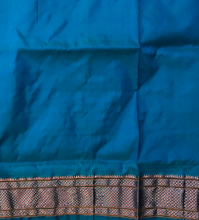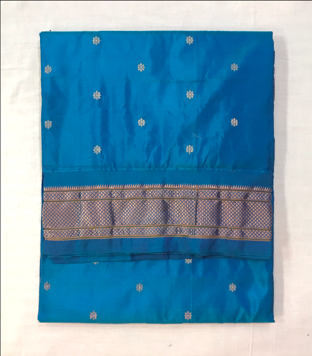 The phenomenal combination of blue Paithani with a very beautiful self coloured border is Pratha's favorite. The delicate floral butti add the needed amount of grace which makes it perfect for any and every special occasion of yours!