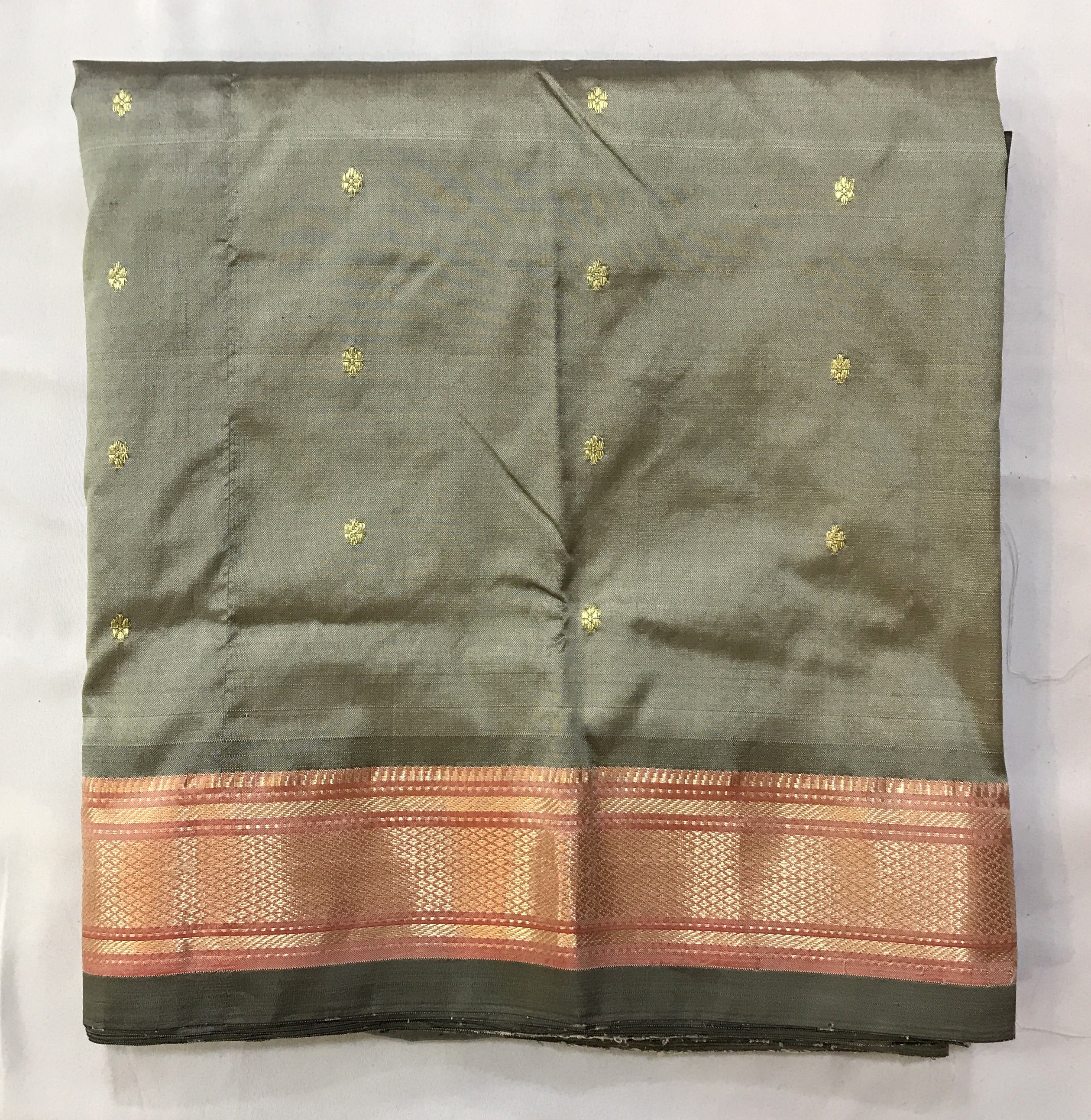 A very outstanding shade of grey with peach coloured golden zari border in traditional Paithani. Do not miss the floral butti highlighted in golden zari thread throughout this Paithani. The traditional tissue pallu with elaborate lotus motifs looks graceful. This is a perfect pick for those who are looking for a unique Paithani to add to their collection.