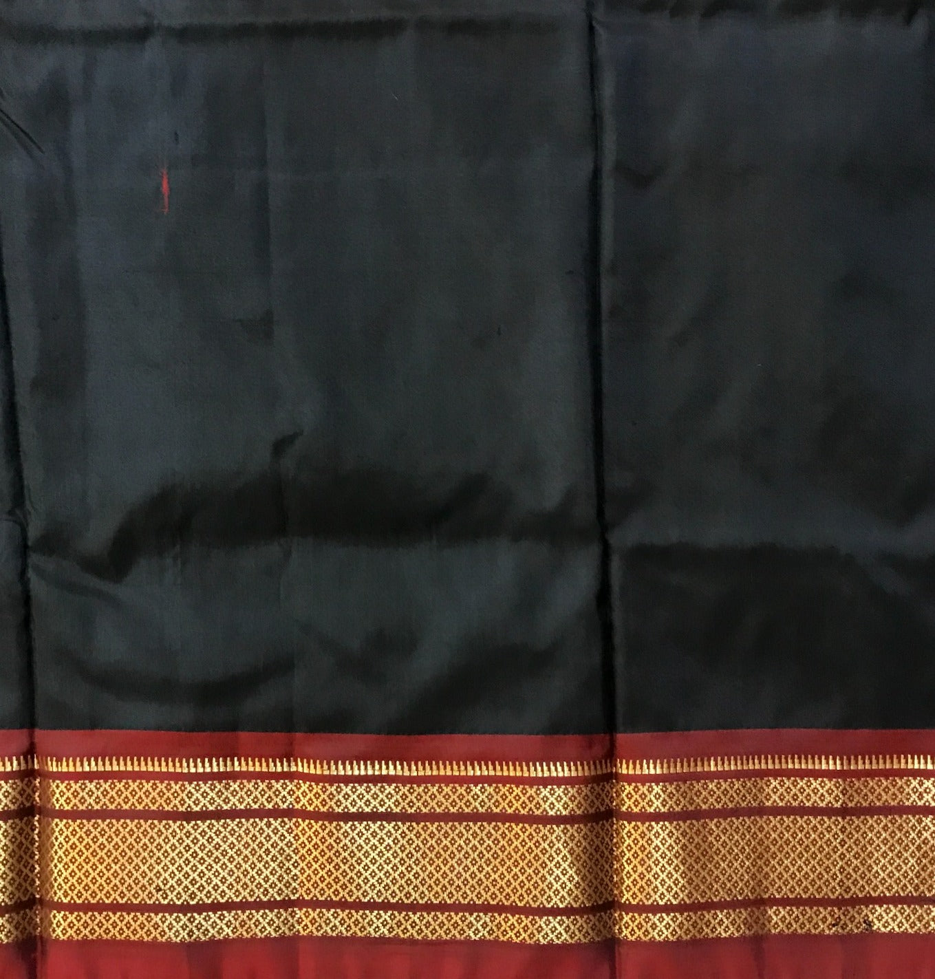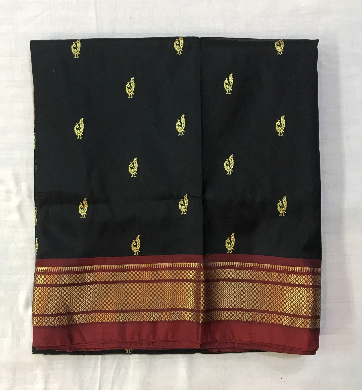 A supreme Paithani weave in this stunning, beautiful shade of black is a treat to your eyes! This with a beautiful shade of brown contrast border looks incomparable! Do not miss the peacock butti highlighted in silk thread throughout this Paithani! The traditional tissue pallu with elaborate peacock motifs looks graceful. This is a perfect pick for those who are looking for a unique Paithani to add their collections!