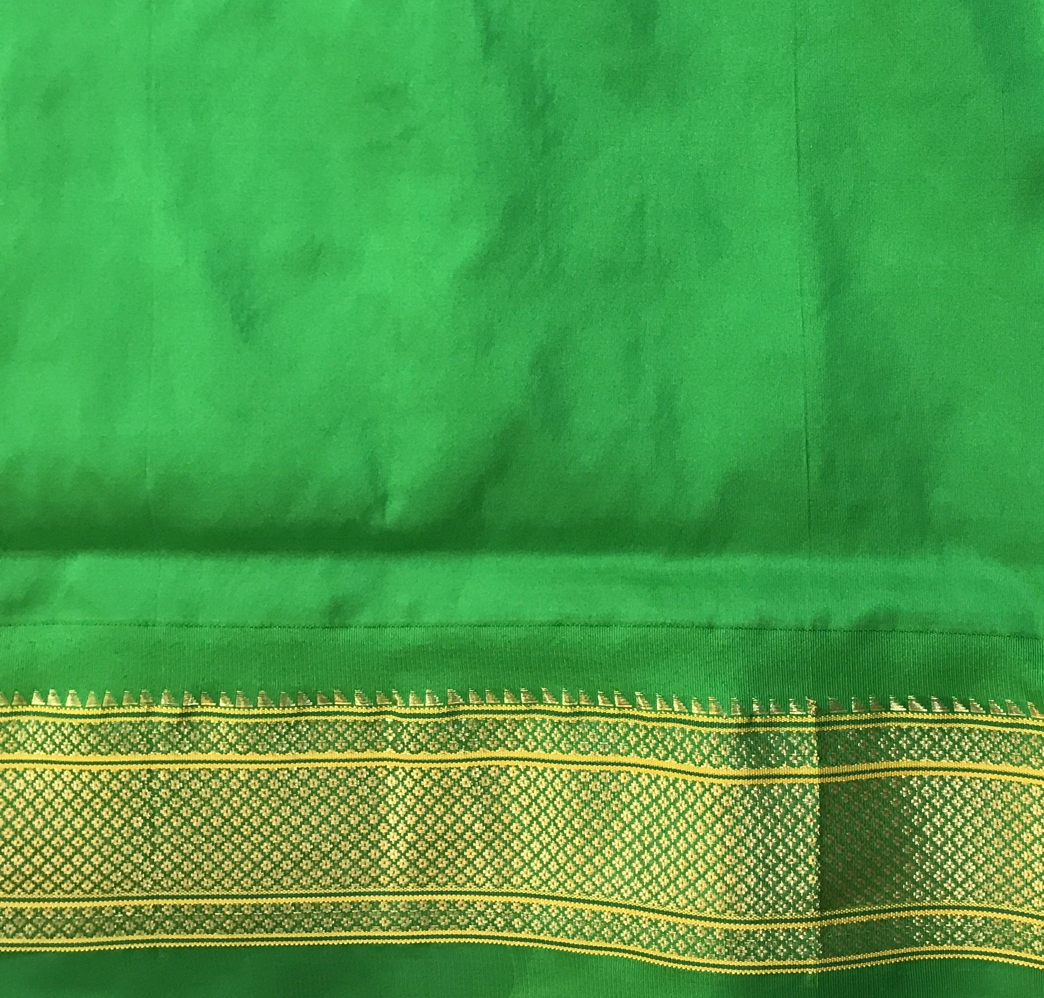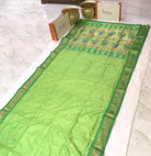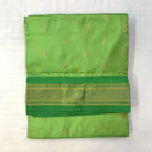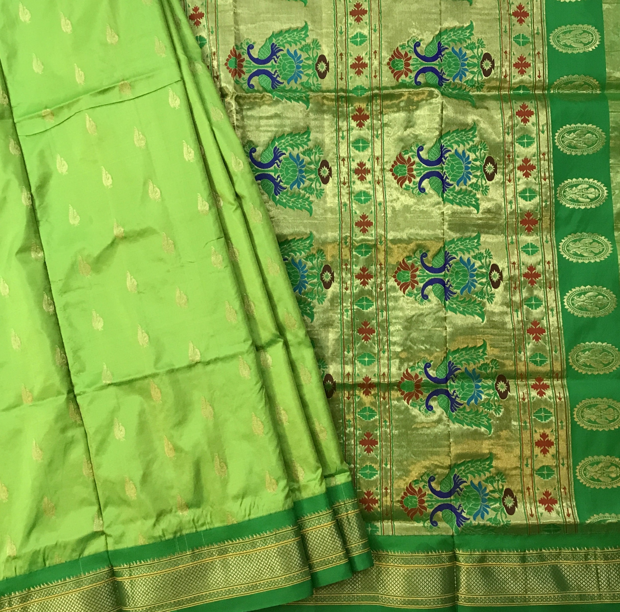 A classy parrot green coloured power loom Paithani, with its added class by the intricate peacock buttis(motifs), is a piece of grandeur. The contrast created with the bright green border and an golden zari pallu looks ethereal. This saree works wonders for any occasion! Do not miss the peacock ( motifs ) design pallu highlighted in multicolored silk thread throughout this Paithani.