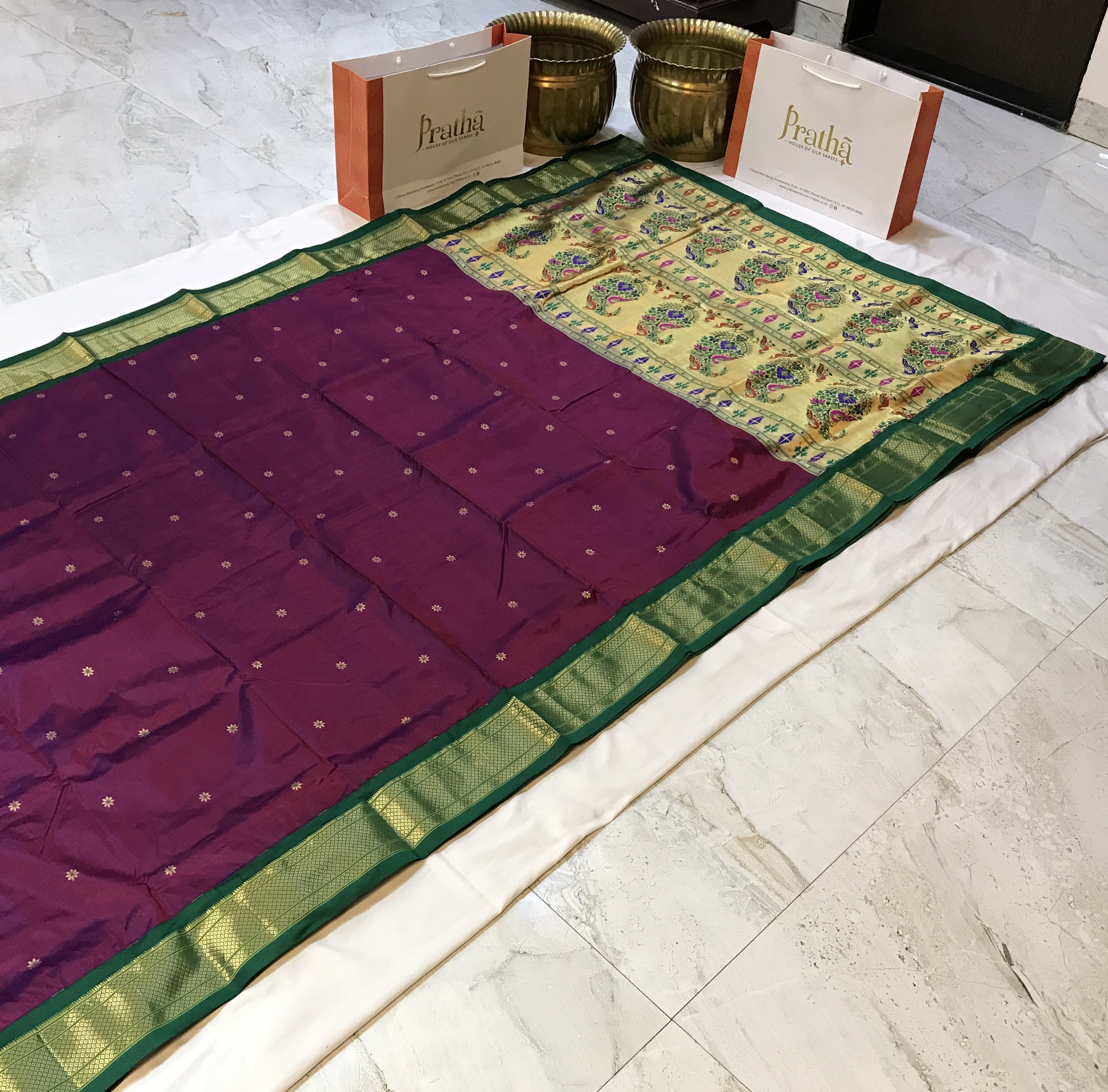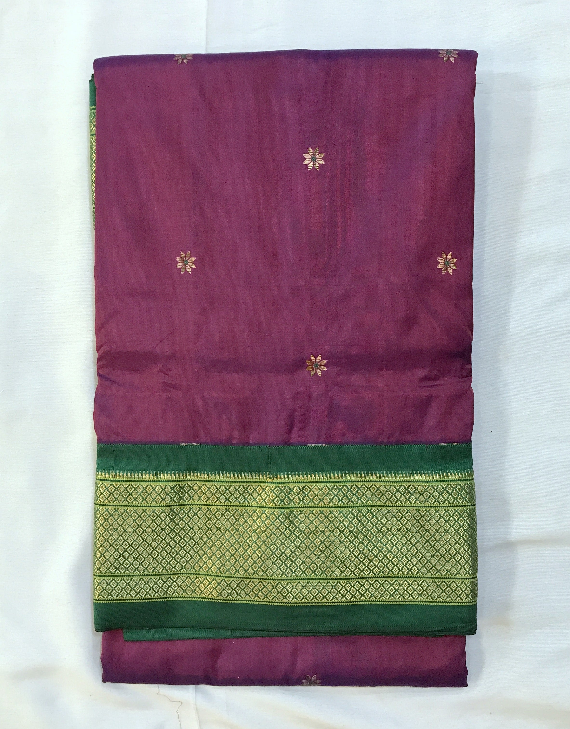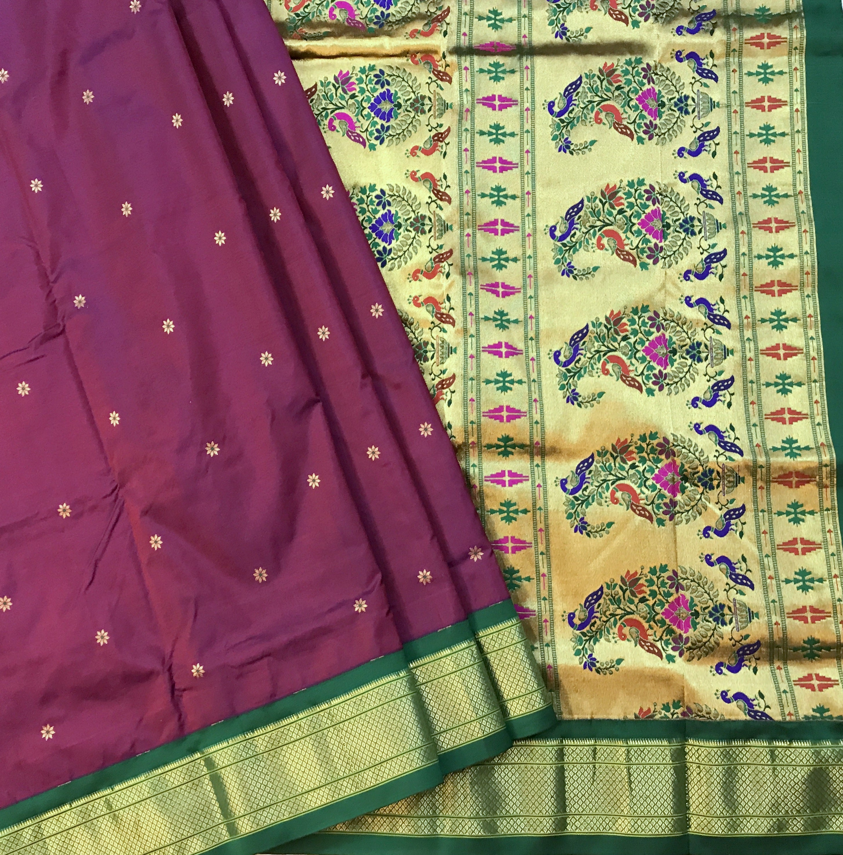 An amazing shade of magenta-wine pure silk Paithani with fresh green border looks absolutely stunning. This classy combination looks marvelous when draped, The power loom butti, pallu and the traditional design of the border give a festive touch to this weave.
