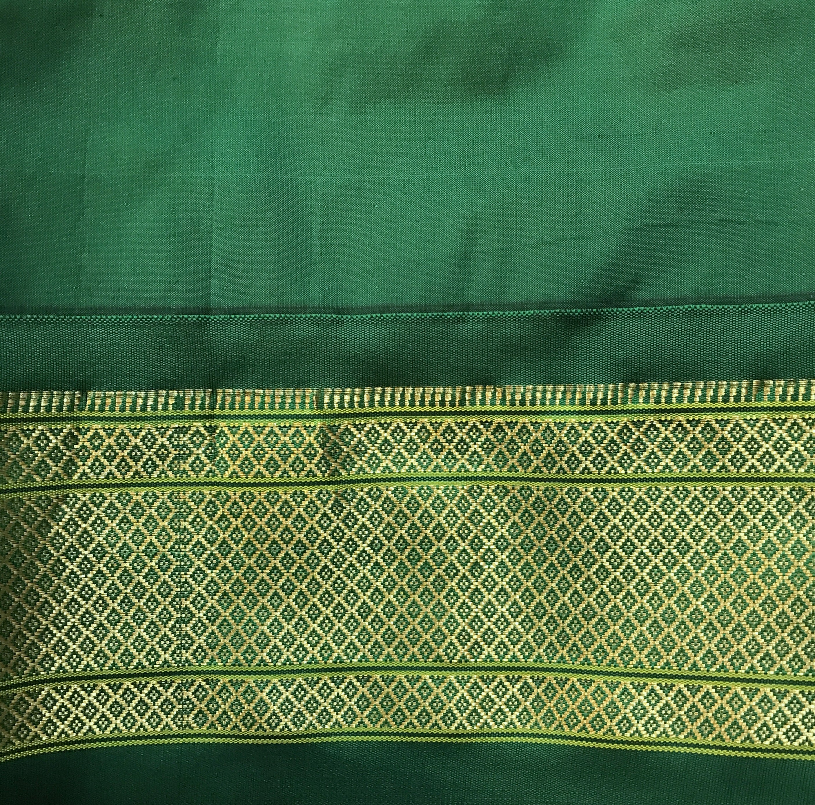 Blouse Colour: Contrast ( Green with golden zari border )