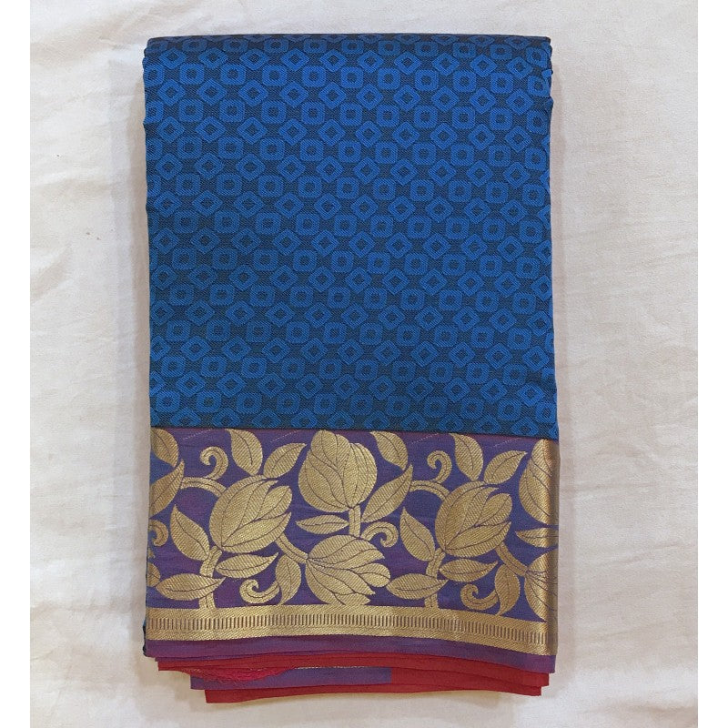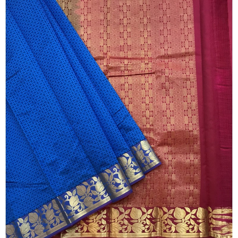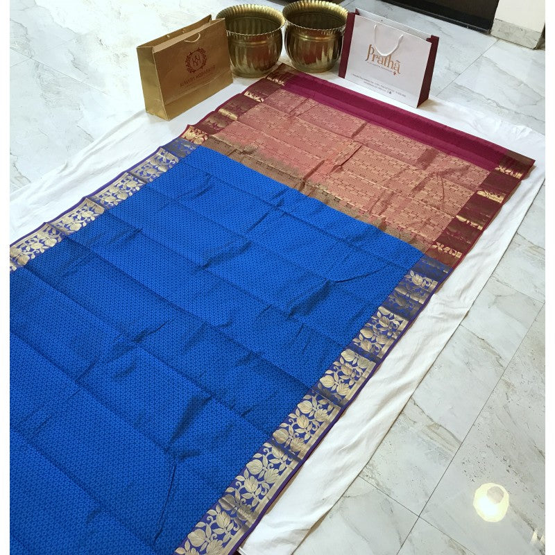 A simple and classy weave of self texture ( block design ) blended Kanchi silk saree made on power loom, it is not a typical Kanjeevaram saree , this one suits all age groups! A very pretty shade of blue colour teamed up with intricated rose design broad border and fresh shade of rani- pink coloured golden zari pallu looks elegant. The simplicity of the pallu adds to the elegance of this saree.