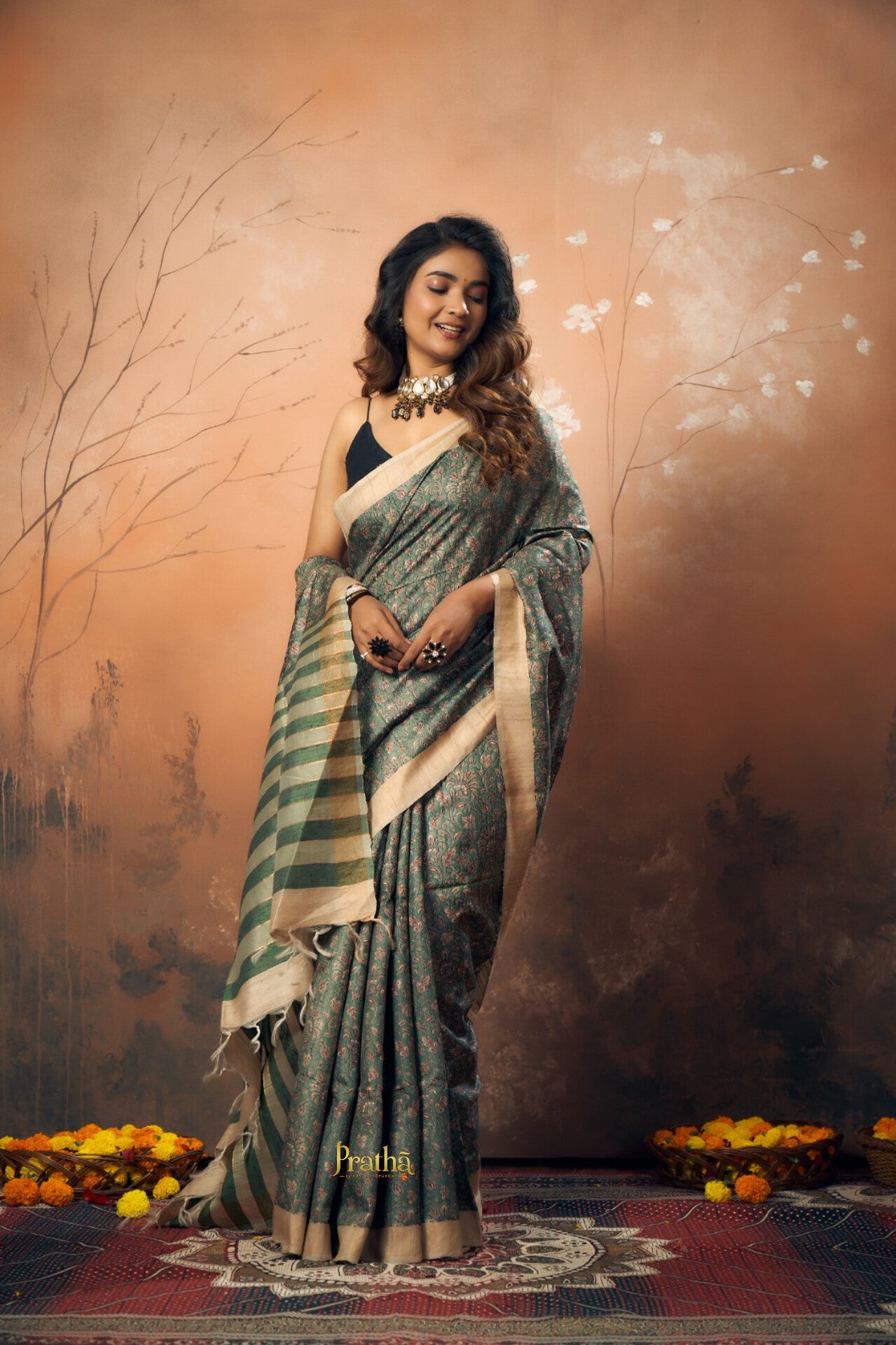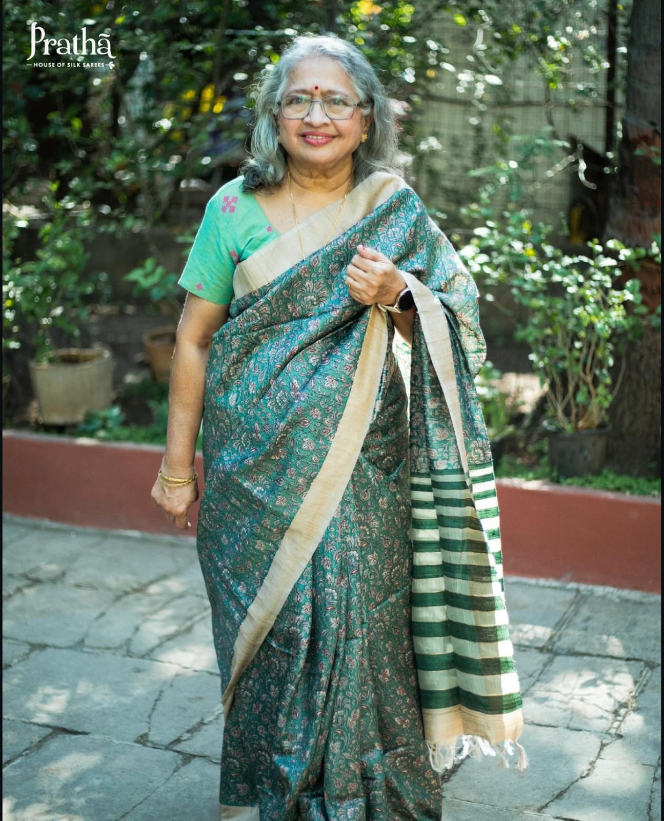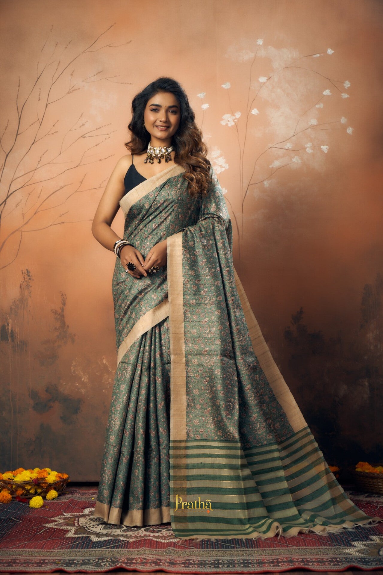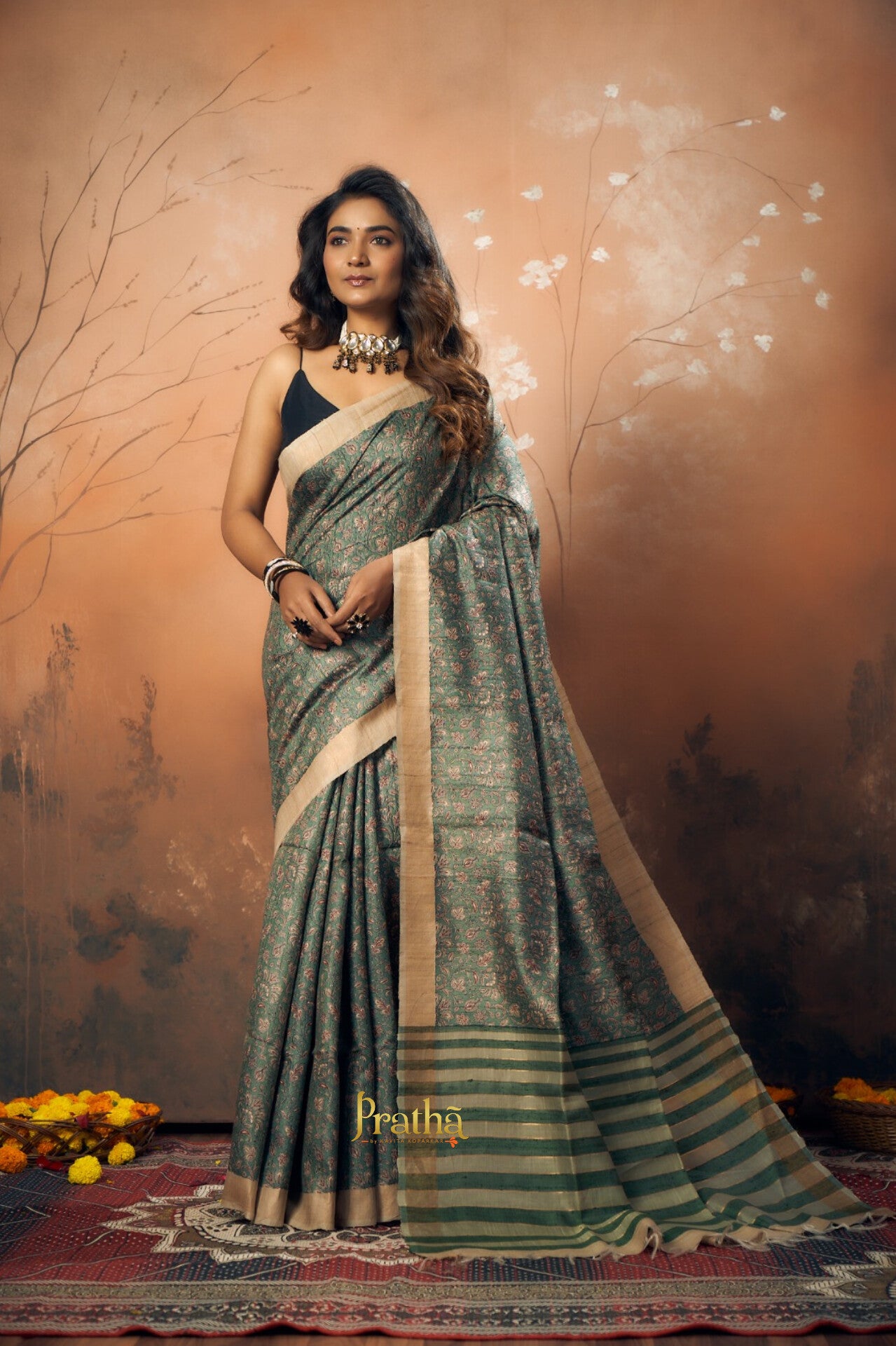 A soothing floral printed design tussar silk saree in a printed design with a combination of all beautiful warm colours, this saree is a keepsake. The multicolored  pallu adds a quirk to the otherwise traditional.  From a casual friends meet, to a brunch and from an office meeting to a n evening party, this one is a perfect classy outfit for all!