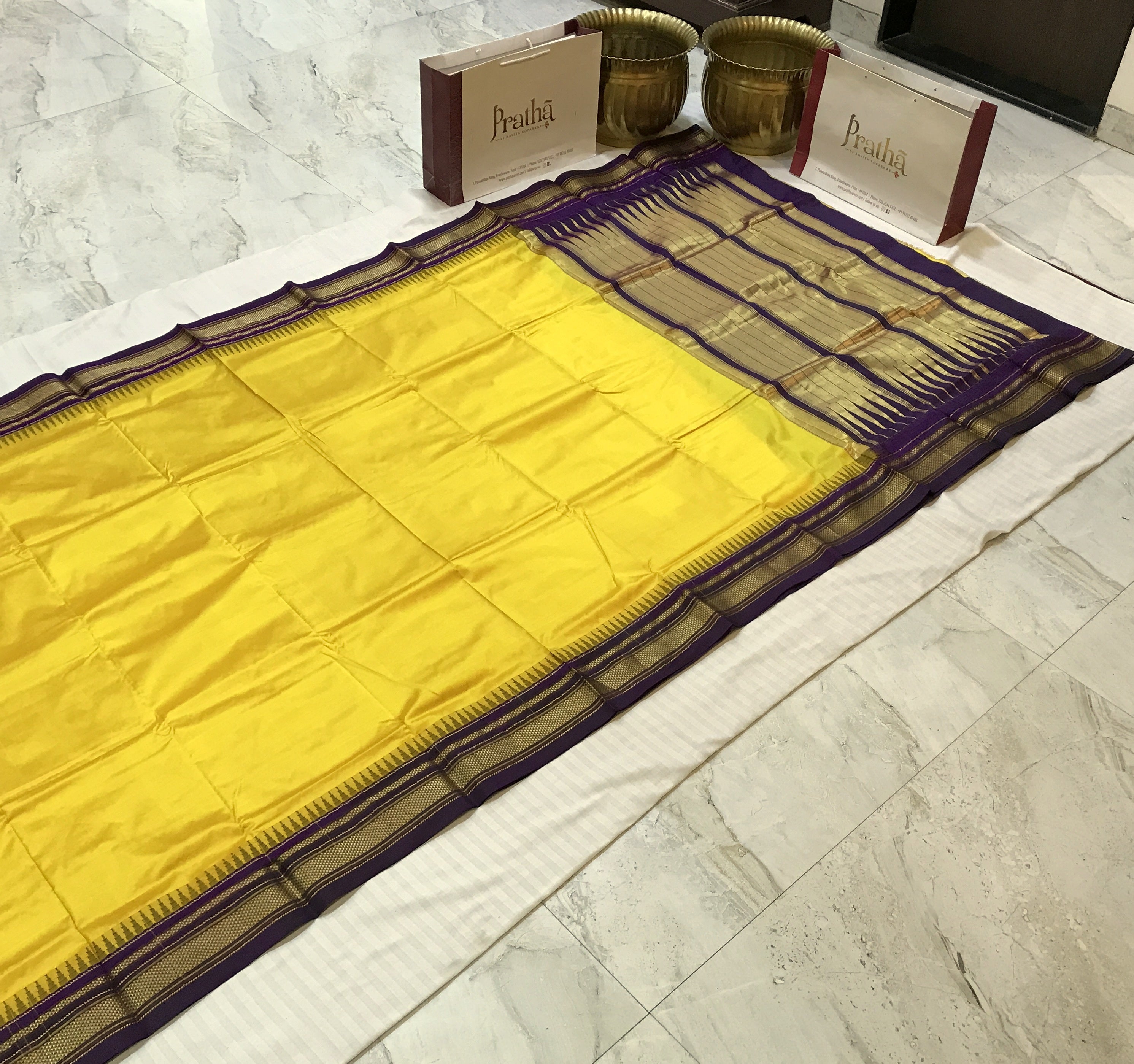 The plain Irkal in a beautiful shade of yellow with purple border, this one is a fashionably unique drape! This pure silk power loom Irkal in these beautiful colours is a keepsake. The plain weave with its traditional temple border and the classic irkal golden zari pallu looks stunning.