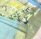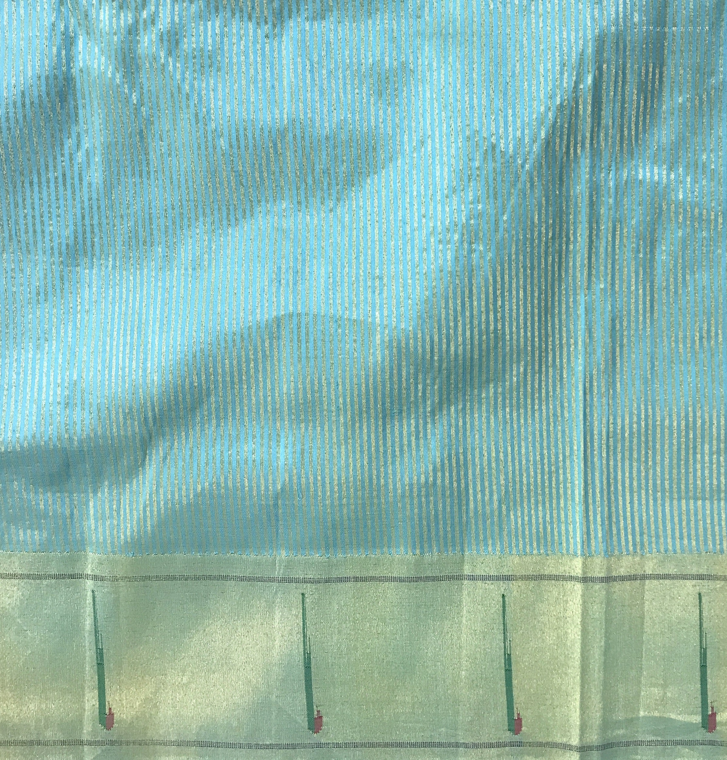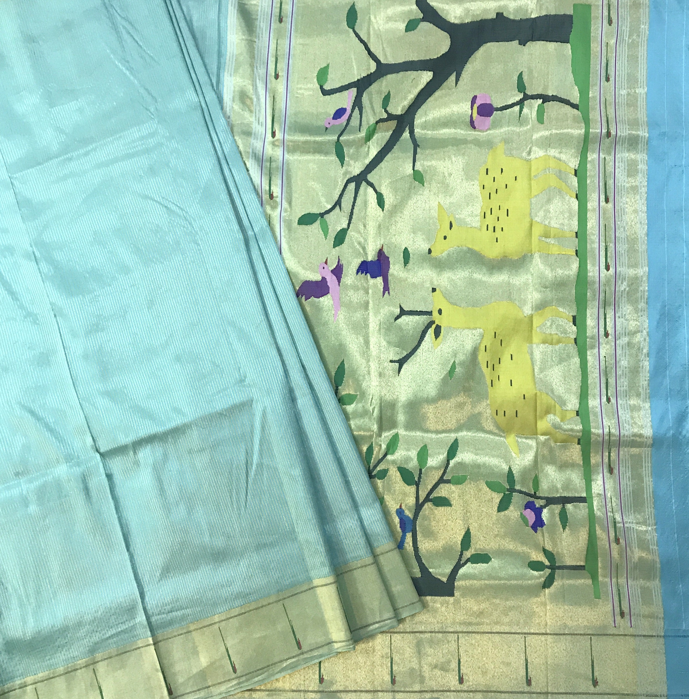 An awesome sky blue shade with golden zari lines, this rich colour in pure silk with the most amazing muniya zari border is a classy combination for a handwoven Paithani. This being a unique border Paithani, handwoven to perfection is a signature piece at Pratha. A very beautiful golden zari lines design all over the saree ,the pallu with its perfect unique motifs of deers, and the colour on itself, makes this weave perfect for weddings or any other festive occasions. This colours looks versatile in different light conditions.