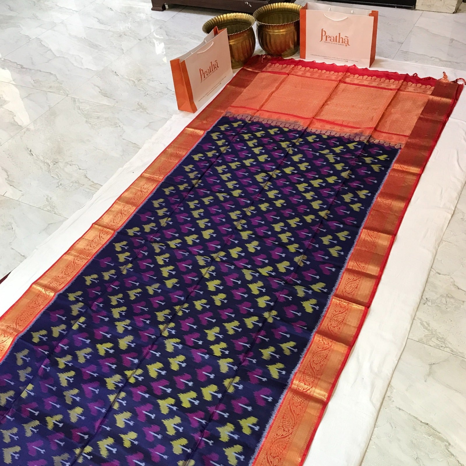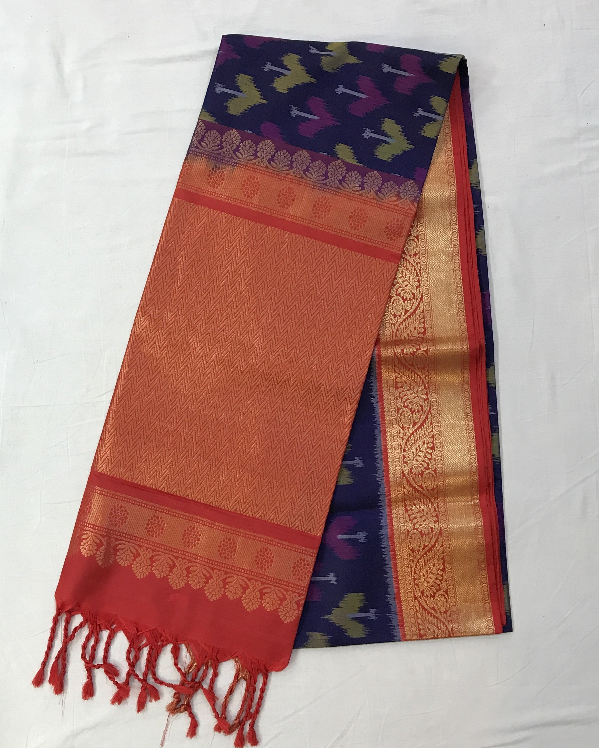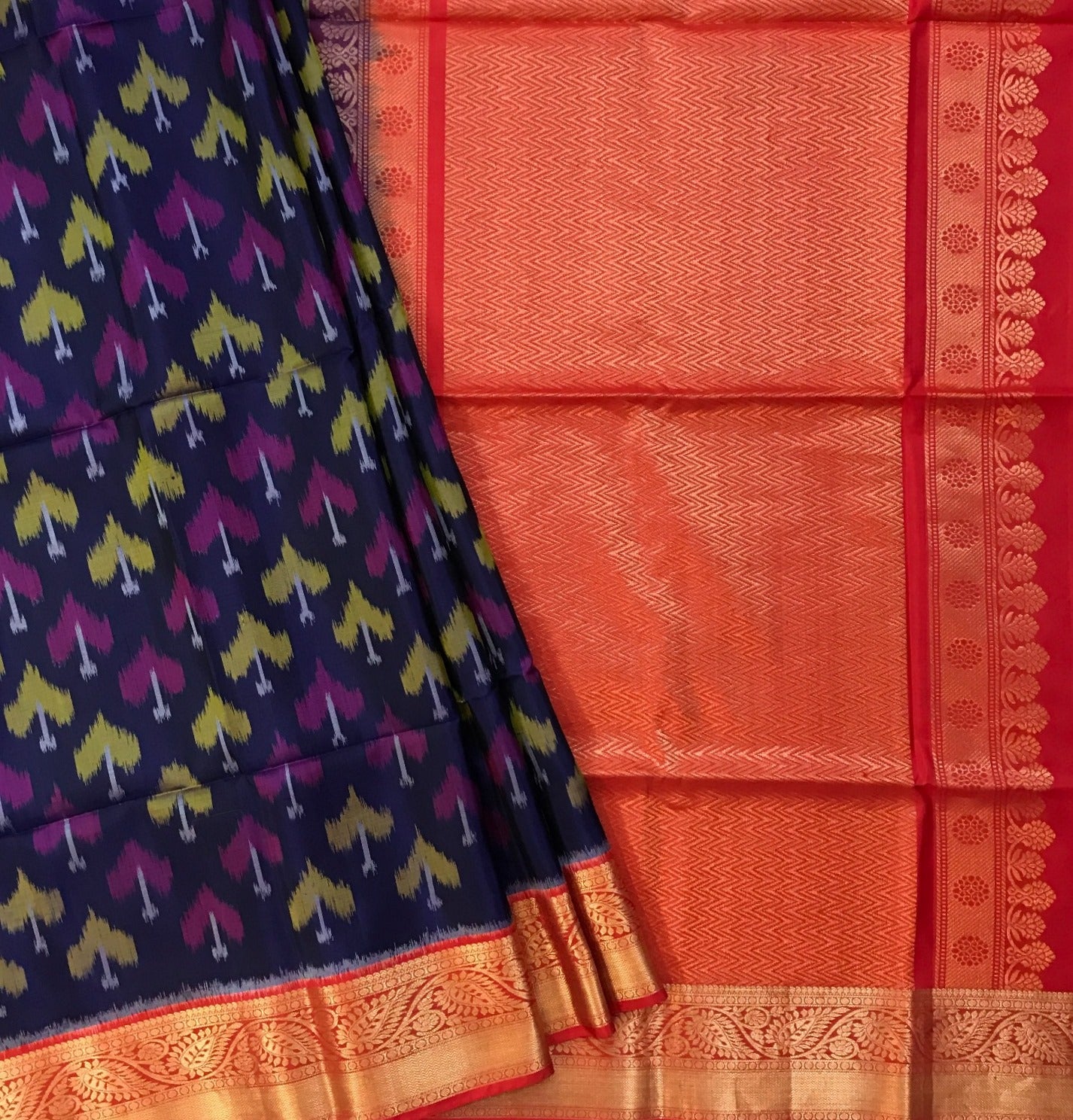 A very beautiful combination of blue Soft Silk saree with its Ikkat design all over the saree , perfect saree for any special occasion! Don't miss the red color traditional golden zari border is looks very fantastic with ikkat design on pallu. Light in weight and easy to drape.