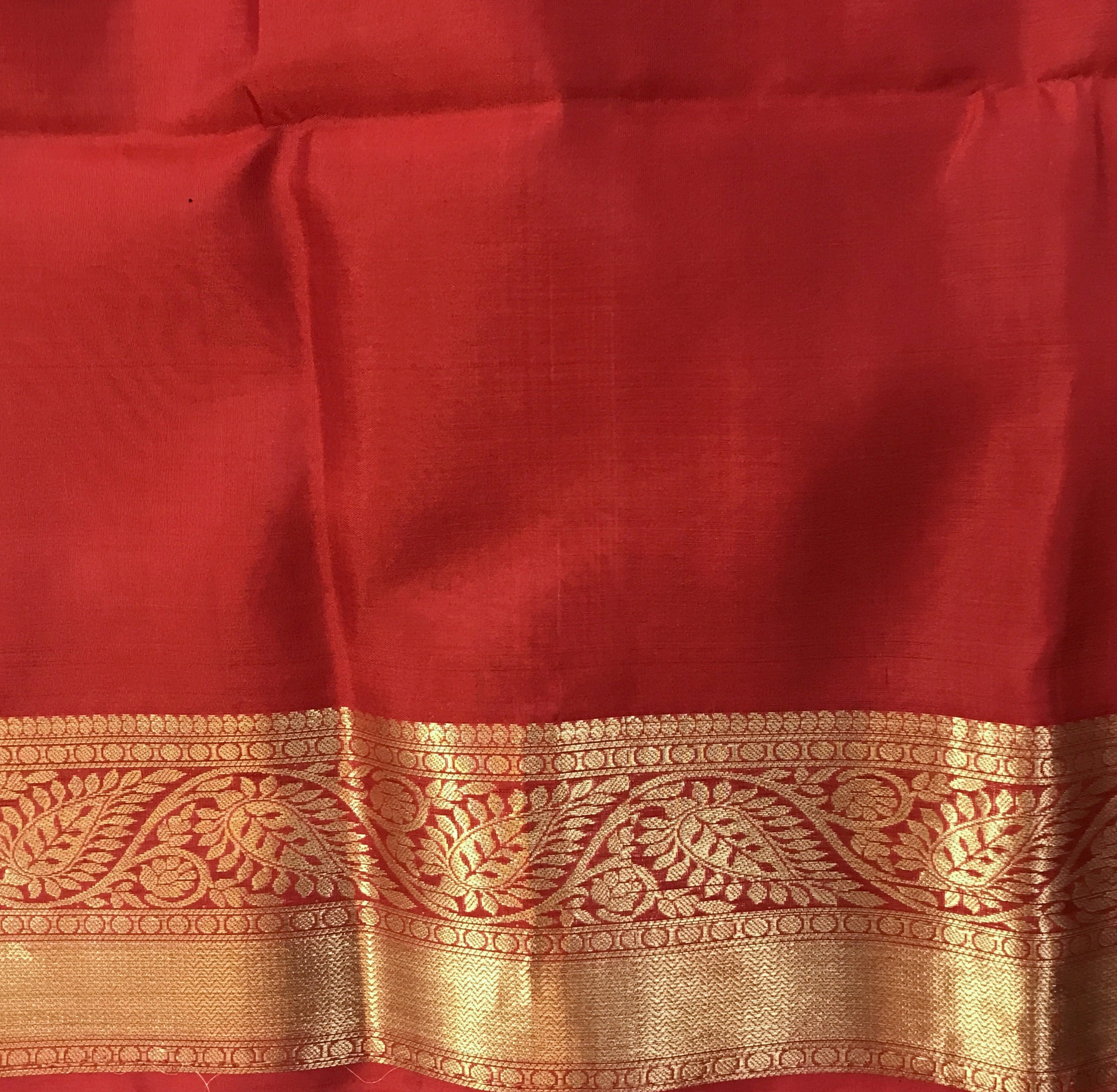 Blouse Colour: Contrast ( Plain red with golden zari border )