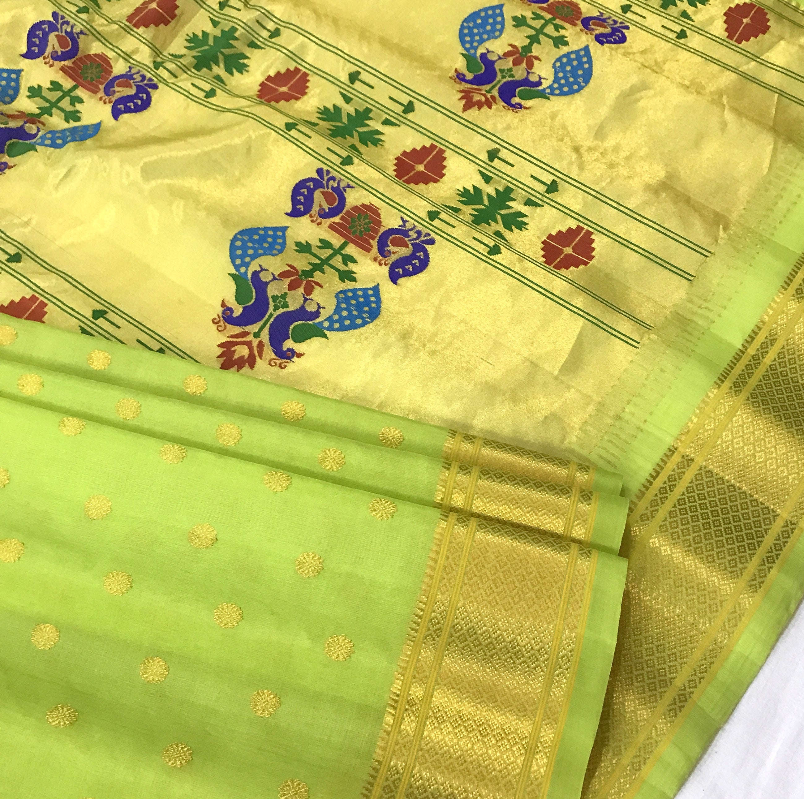 An amazing Parrot green shaded Tussar Paithani looks absolutely stunning. This classy combination looks marvelous when draped, the butti, pallu and the traditional design of the border give a festive touch to this weave.